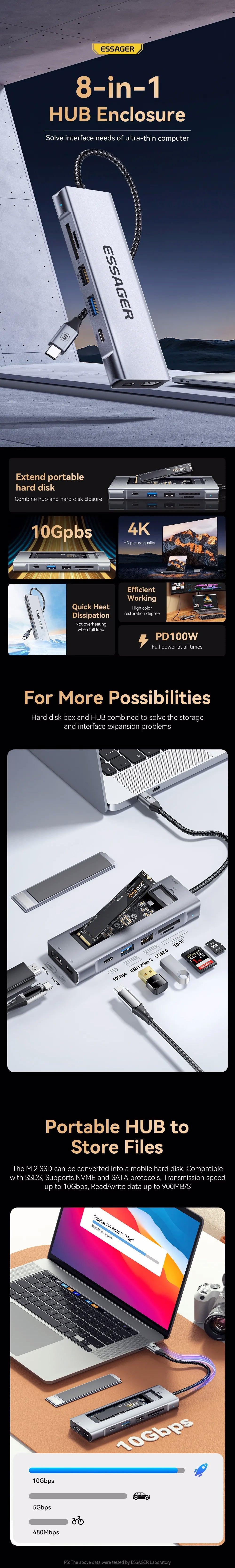 Essager 8-in-1 USB C Hub with 10Gbps M.2 NVMe SSD Enclosure