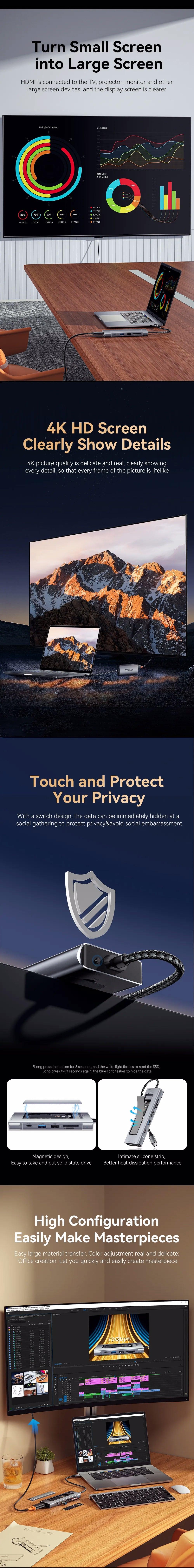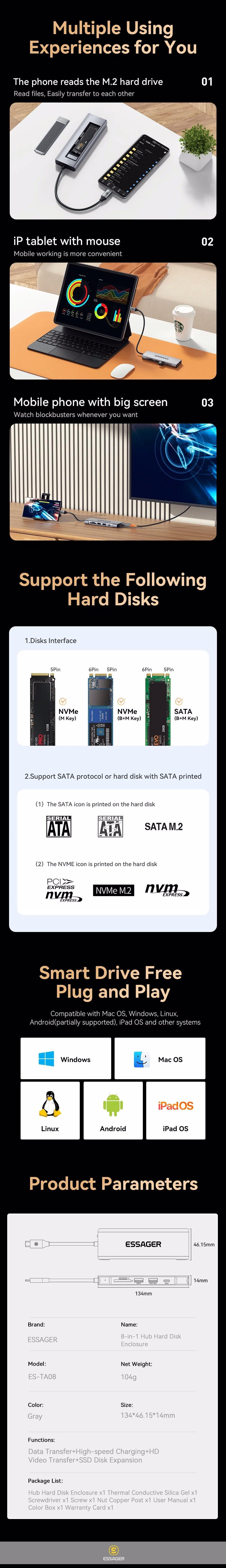 The Essager 8-in-1 USB-C Hub is a versatile and high-performance expansion device, combining an M.2 NVMe/SATA SSD enclosure, a PD100W fast charging port, 4K HDMI output, 10Gbps USB 3.2 Gen2 port, USB 2.0 connectivity, and an SD/TF card reader. With a lightning-fast 10Gbps transfer rate and compatibility with various SSD sizes, it works seamlessly on Windows, macOS, Linux, and Chromebook OS. You can enjoy 4K video output at 3840 x 2160@30Hz, and the PD100W fast charging and rapid card reading capabilities are very convenient. Its sleek aluminium alloy design ensures efficient heat dissipation and portability, making it a great companion for laptops like MacBook Pro/Air, Huawei P30/Mate30, Samsung Note10/S10, and more. Installation is easy with the included screws.