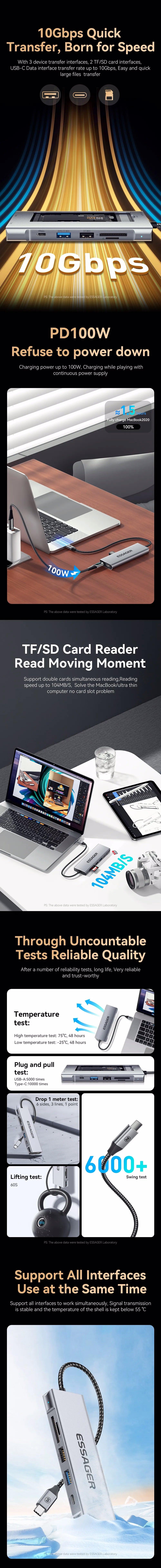High-Performance USB-C Expansion: Essager 8-in-1 USB-C Hub features an M.2 NVMe/SATA SSD enclosure, a PD100W rapid charging port, 4K HDMI output, 10Gbps USB-C 3.2 Gen2 port, USB 2.0 connectivity, and an SD/TF card reader, designed to meet a wide range of your connectivity requirements.