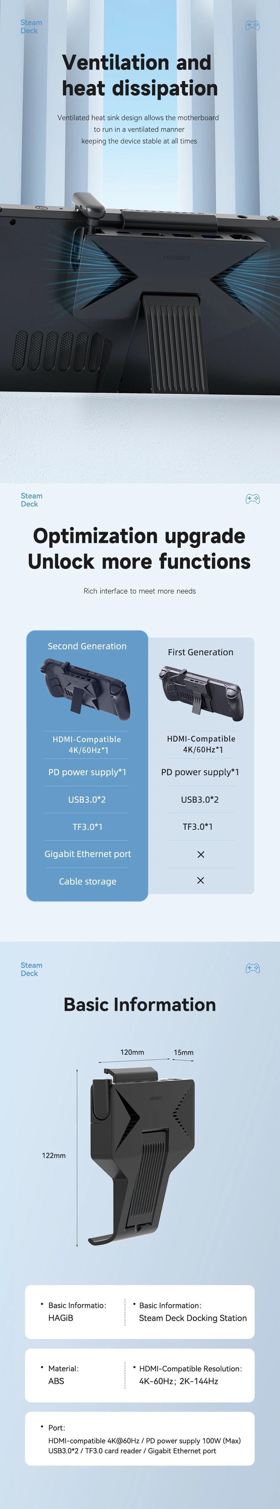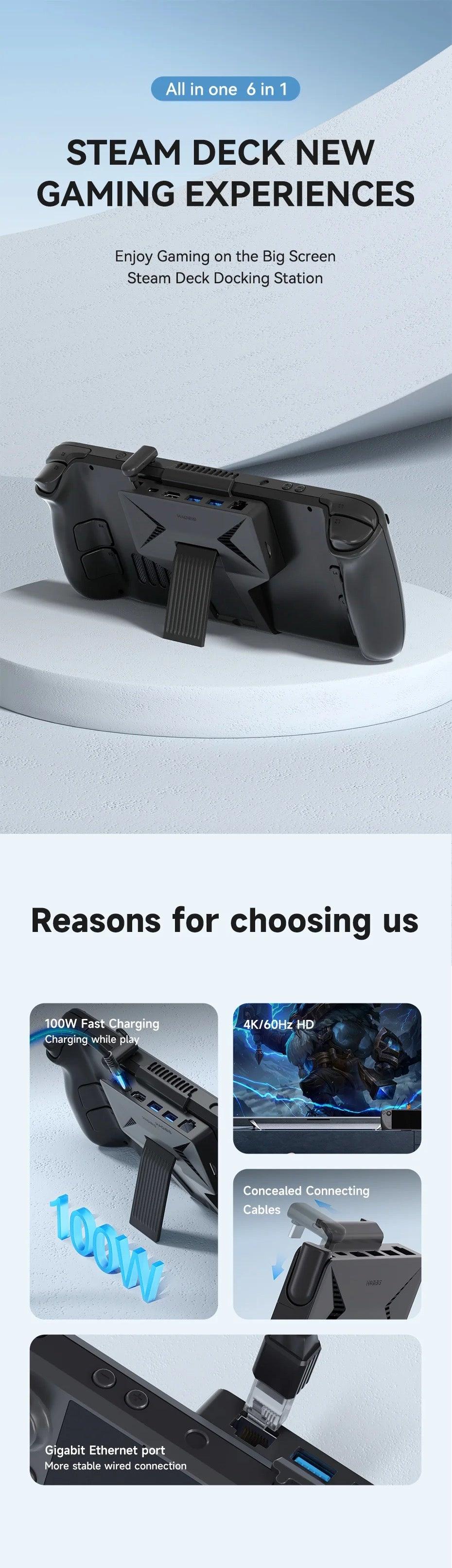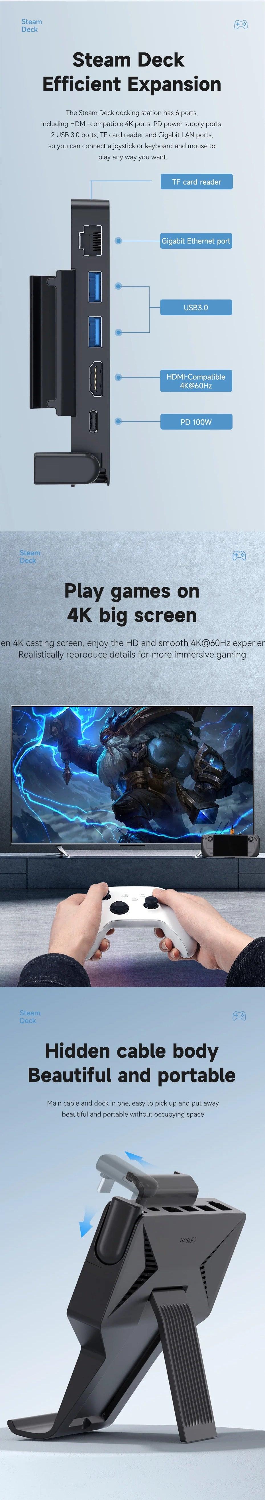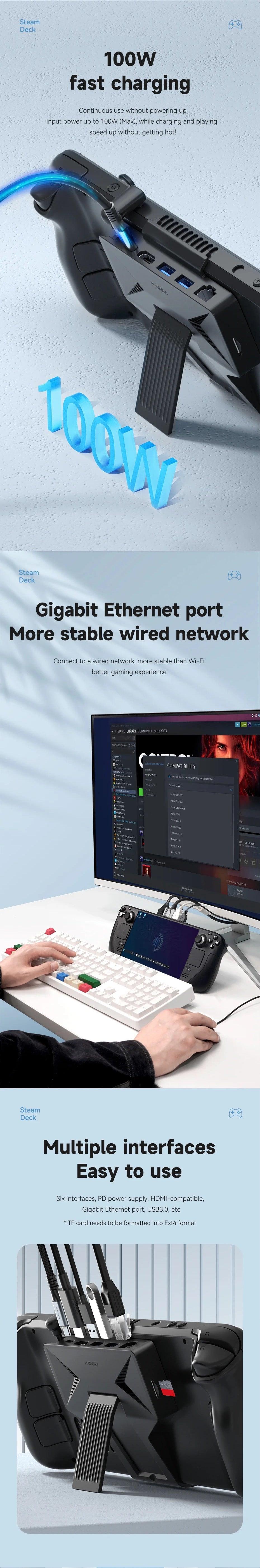 Docking Station for Steam Deck: Enhance your Steam Deck experience with the Hagibis 6-in-1 Docking Station! This versatile docking station offers a 4K@60Hz HDMI 2.0 port, a 1000Mbps RJ45 port, a Micro SD card reader, 2 USB 3.0 ports, and a 100W PD USB-C port for full-speed charging. Connect your controller, keyboard, and mouse effortlessly and enjoy gaming your way.