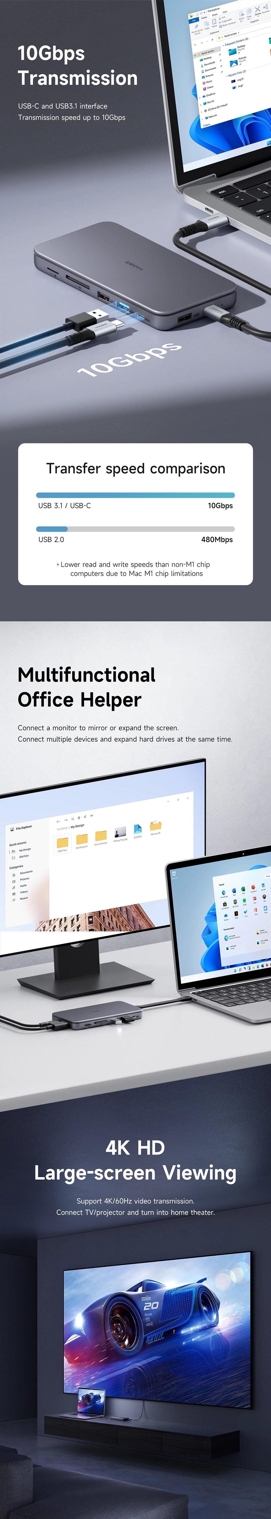 9-in-1 USB-C Hub: Expand your USB-C port with a 4K@60Hz HDMI output, 100W Power Delivery, 10Gbps USB 3.2 Gen 2, USB 2.0, SD 3.0 Card Reader, and Micro SD 3.0 Card Reader to meet all your essential needs.