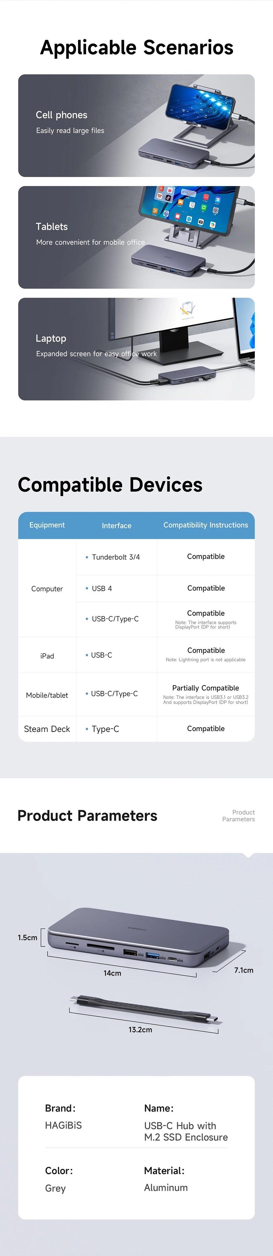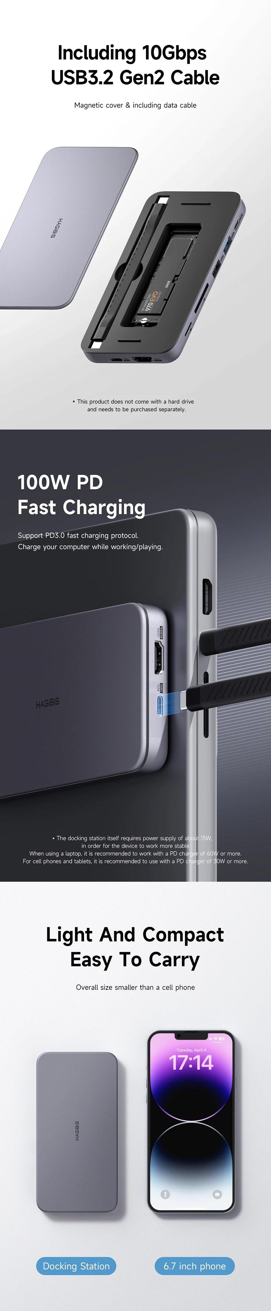 Innovative Design: Hagibis integrates an M.2 NVMe SATA Hard Drive Enclosure with a versatile USB-C Docking Station, compatible with MacBook, iPad Pro, Mac Mini, laptops, Samsung Note10/S10, and Huawei P40/Mate30.