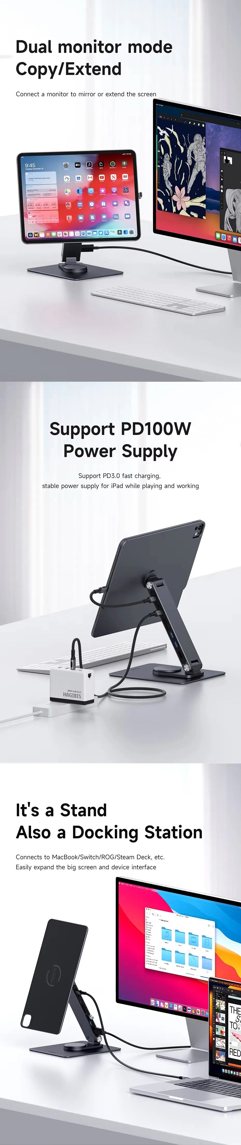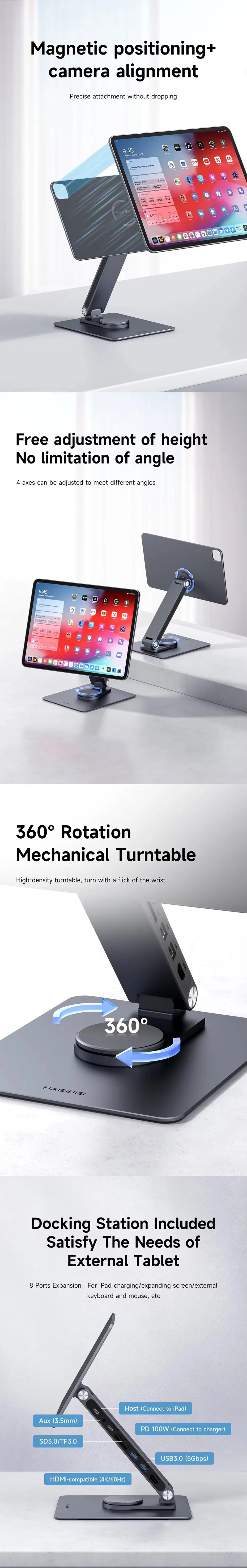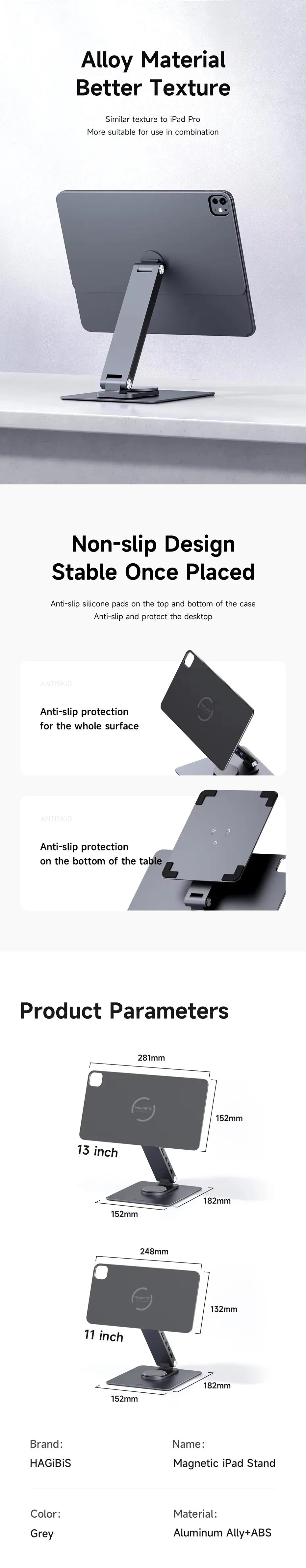 Magnetic iPad Stand: Hagibis introduces a new magnetic iPad stand crafted from high-quality aluminium alloy, featuring a larger, thicker base with a centre of gravity design. It offers strong magnetic suction and comprehensive non-slip rubber protection, ensuring stable, wobble-free support.