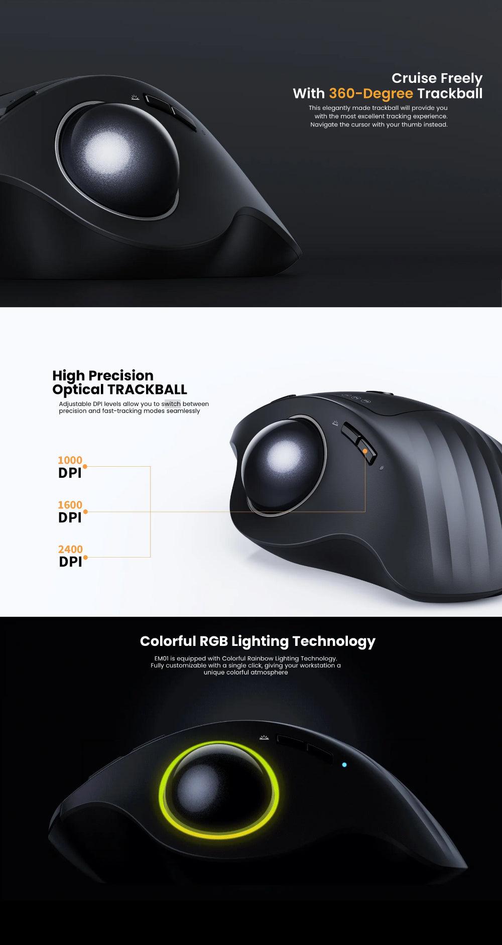 Rechargeable & Adjustable DPI: The Bluetooth Wireless Trackball Mouse features a built-in 900mAh lithium battery, eliminating the need for battery replacements. With the lights turned off, it can provide up to a month of usage on a single full recharge. We recommend switching it off during extended periods of non-use for optimal performance. Additionally, the mouse offers three DPI settings (1000/1600/2400 DPI) for effortless cursor sensitivity adjustment, ensuring smooth tracking across different surfaces.
