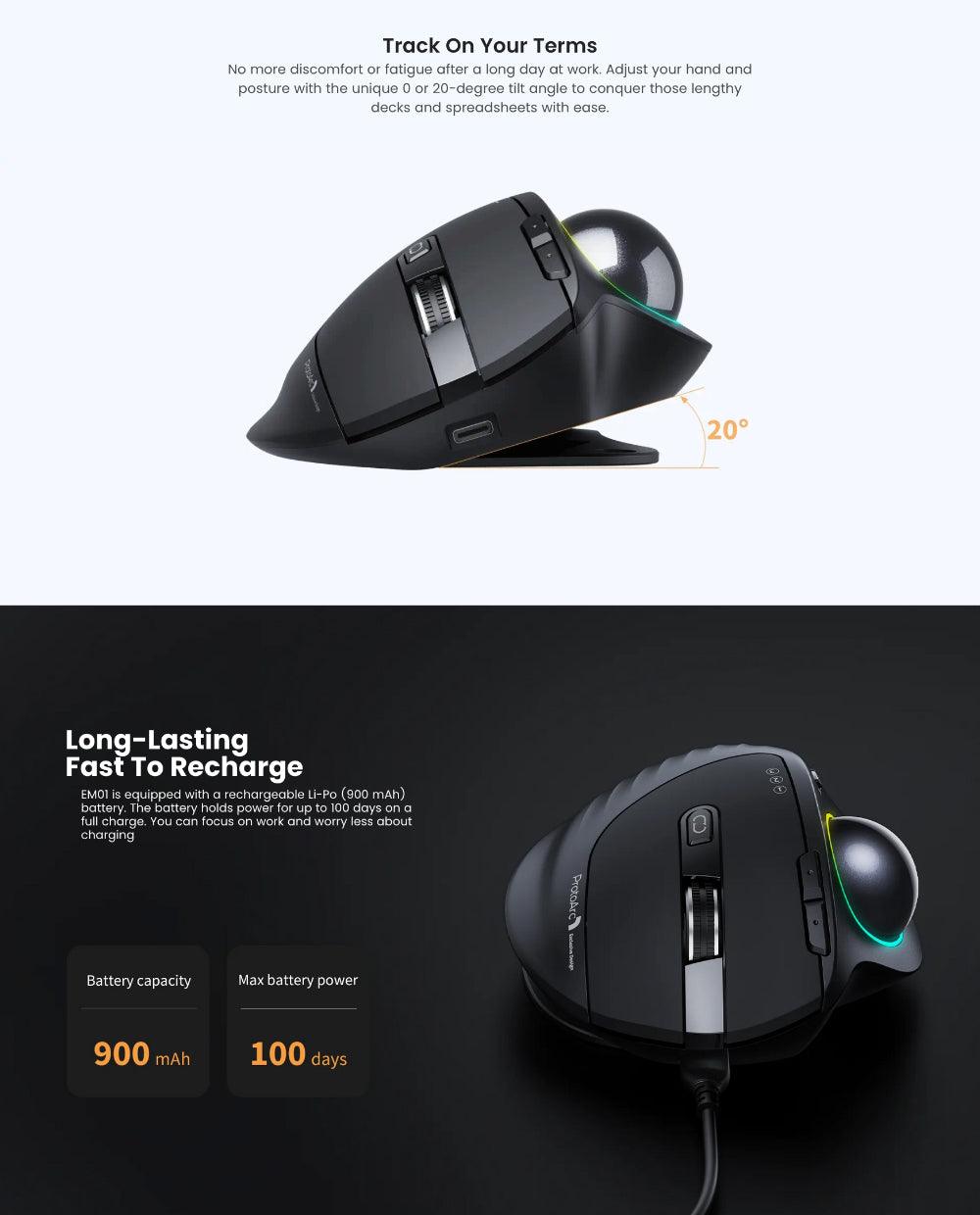 Adjustable Angle Design: With its innovative adjustable hinge, you can tailor the trackball angle to your preference, ranging from 0 to 20 degrees. This feature ensures a more natural and comfortable hand position, reducing muscle strain. Additionally, please be aware that the mouse will automatically enter sleep mode after a few minutes of inactivity to conserve battery. To wake it up, simply click, and it will return to its working mode.