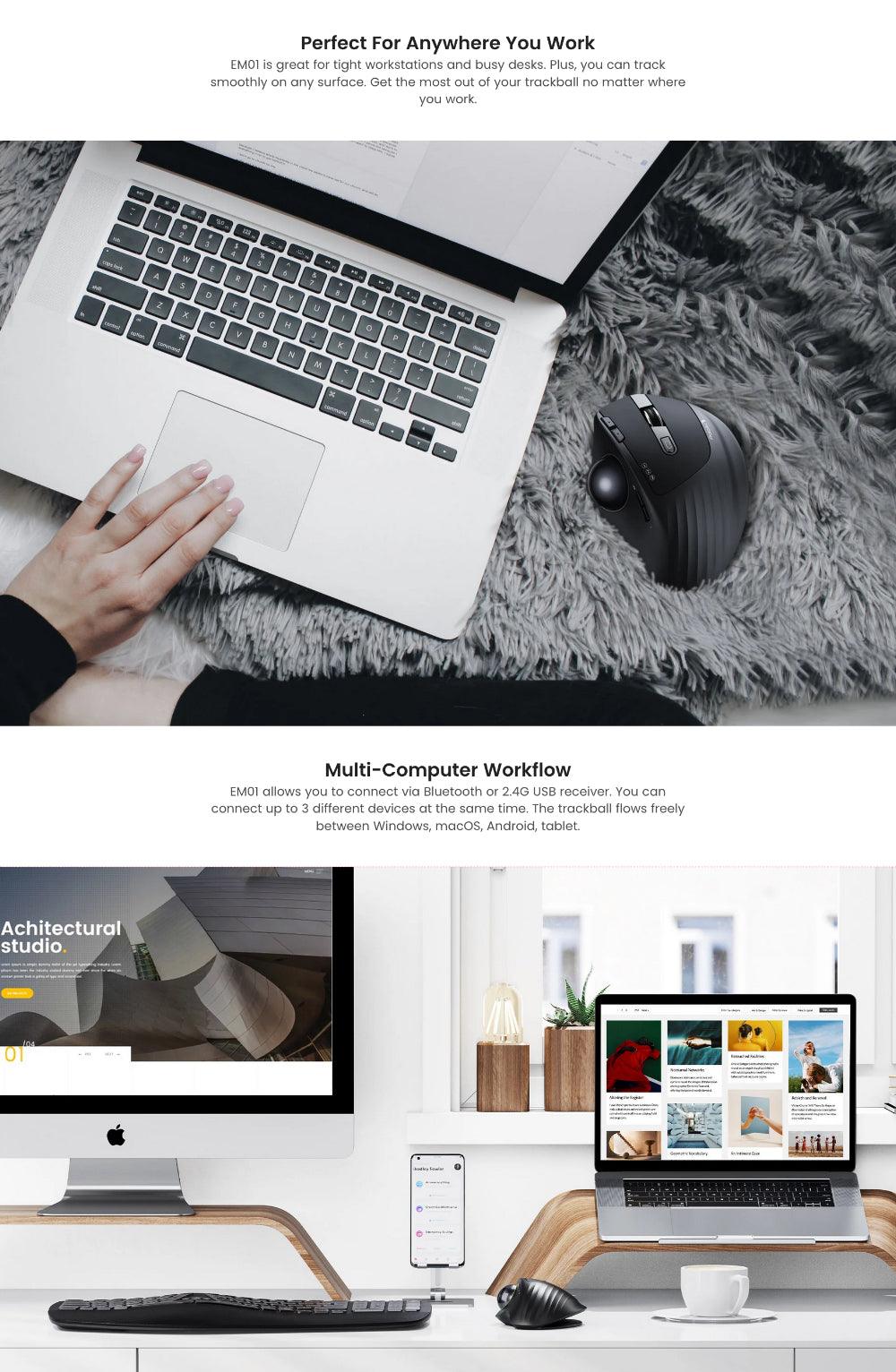 Seamless Bluetooth & 2.4G Wireless Connectivity: Effortless Plug & Play. The USB-A receiver is stored in a separate inner package, not on the back of the mouse. This trackball mouse offers versatile triple connection modes, enabling you to effortlessly manage three devices simultaneously. Switch between Android, tablet, and Mac with a single button press. It is compatible with Windows, Android, Mac OS, and a wide range of PC, laptop, and desktop devices.