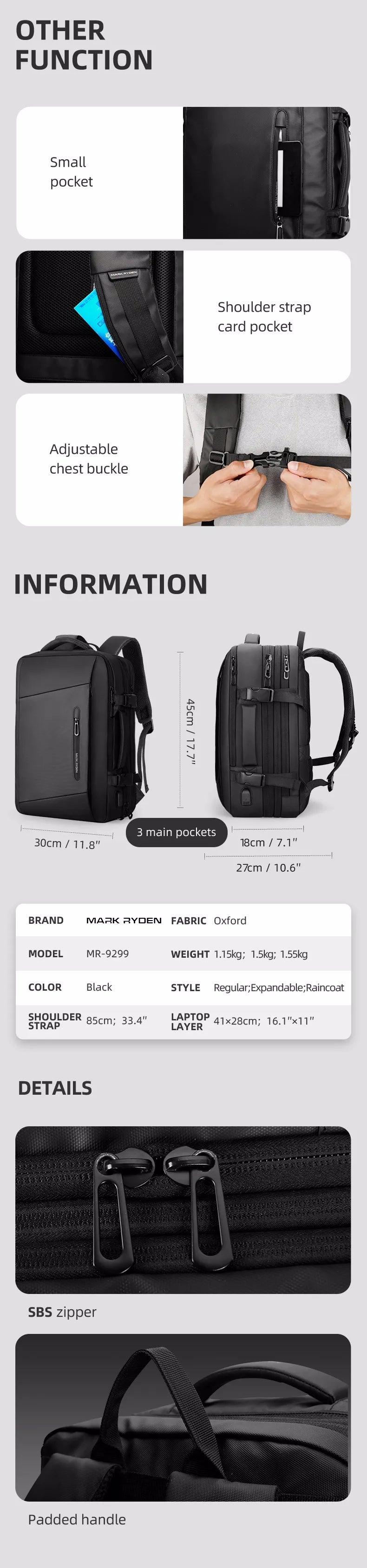 Mark Ryden Large and Flexible Capacity Backpack: With a compressed capacity of 26 litres and a full-length zipper that expands it to 38 litres, this versatile bag offers ample storage. It boasts 16 pockets, including dry/wet dividers, ensuring organised packing. This multi-carry backpack functions as a daypack, carry-on, or handbag, with a side handle for easy conversion. It securely holds laptops up to 17 inches and features a rear strap for luggage attachment. Crafted from waterproof materials, it shields your belongings from rain, and the built-in USB port allows smartphone charging on the go. Perfect for hassle-free travel, it complies with IATA flight size regulations. Dimensions: 45 x 30 x 18 cm (normal) and 45 x 30 x 27 cm (extended).
