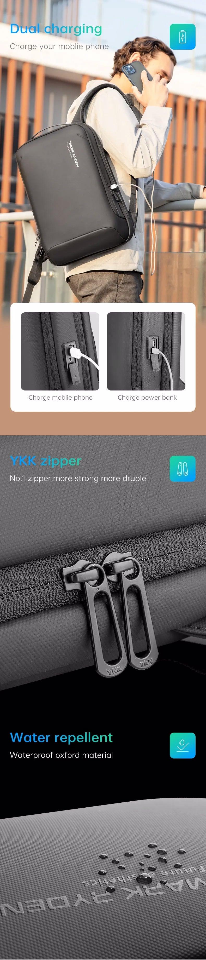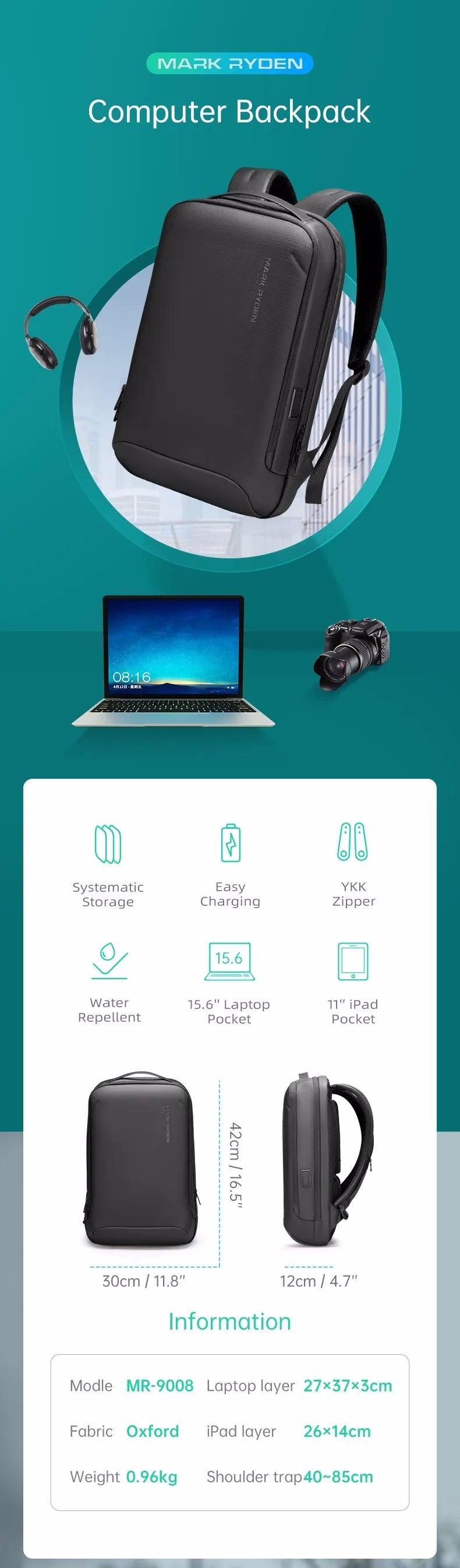 Mark Ryden Profession Waterproof Hardshell Laptop Backpack, crafted from robust polyester and eco-friendly Oxford fabric, offering superior tear and water resistance. It maintains its shape even under pressure. Safety is paramount with its hidden anti-theft pocket, perfect for safeguarding passports, wallets, and phones. It rests snugly against your waist, deterring thieves. Travel convenience is enhanced by the luggage strap for trolley attachment. Enjoy comfort on the move with the breathable mesh back and wide shoulder straps with cushioning. This 15.6-inch laptop backpack is thoughtfully designed for your active lifestyle. Dimensions: 42 × 30 × 12cm.