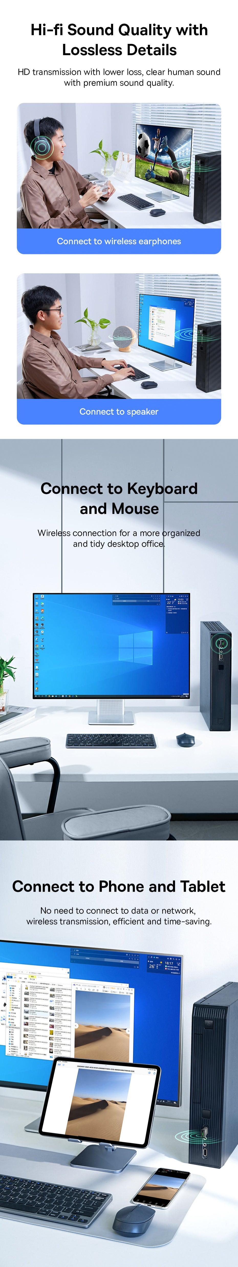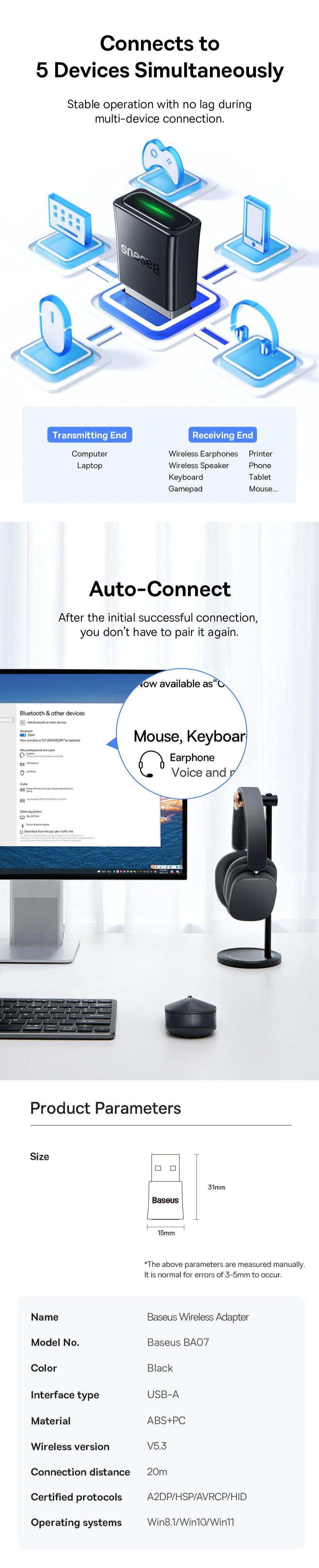 Enhanced Multi-Device Connectivity: Offers rapid pairing and an extended operating range compared to Bluetooth 4.0. Compatible with a wide range of devices, including Bluetooth speakers, headphones, headsets, keyboards, mice, mobile phones, laptops, and more. It can also seamlessly connect with Bluetooth printers and stereo headphones.