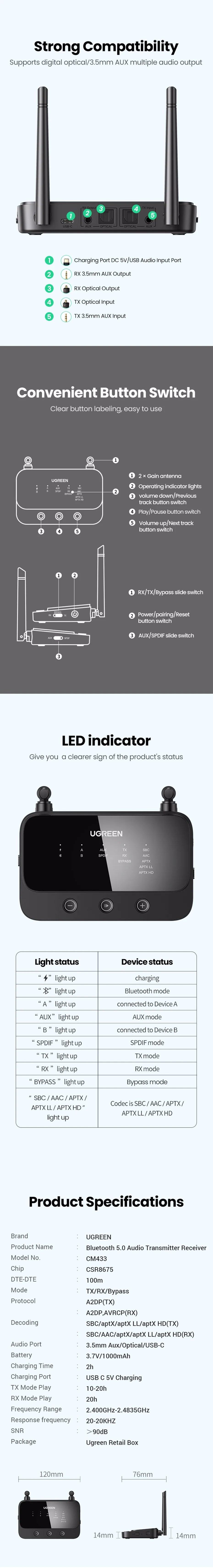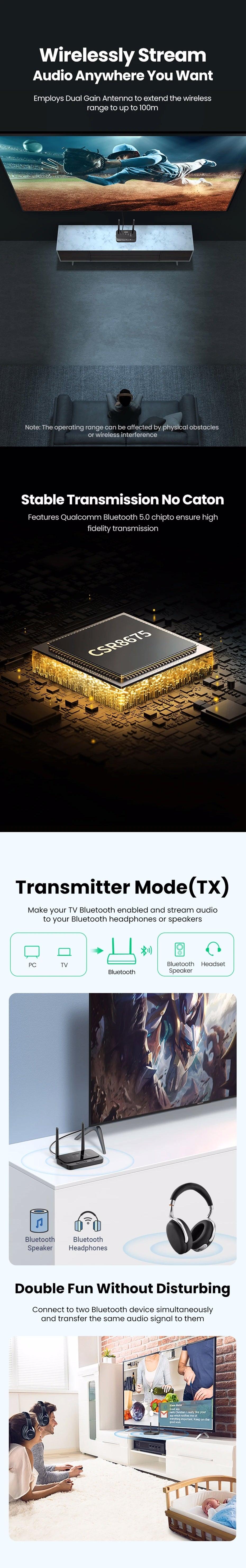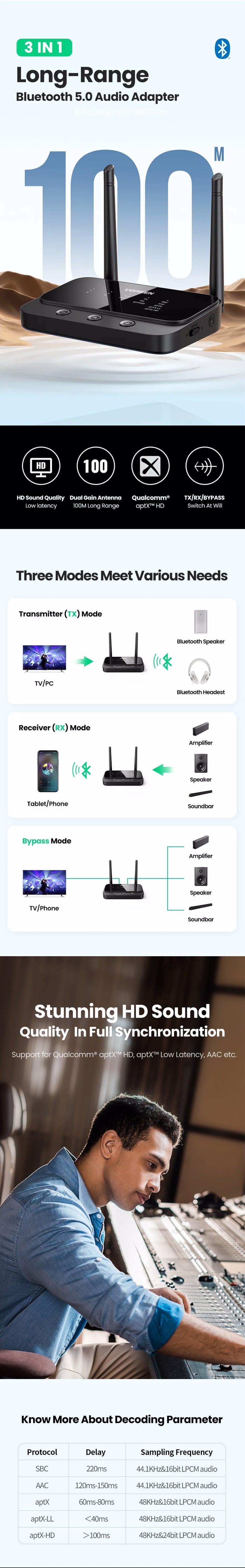 Ugreen 100m Long Range Bluetooth 5.0 Transmitter Receiver Adapter AptX LL Audio