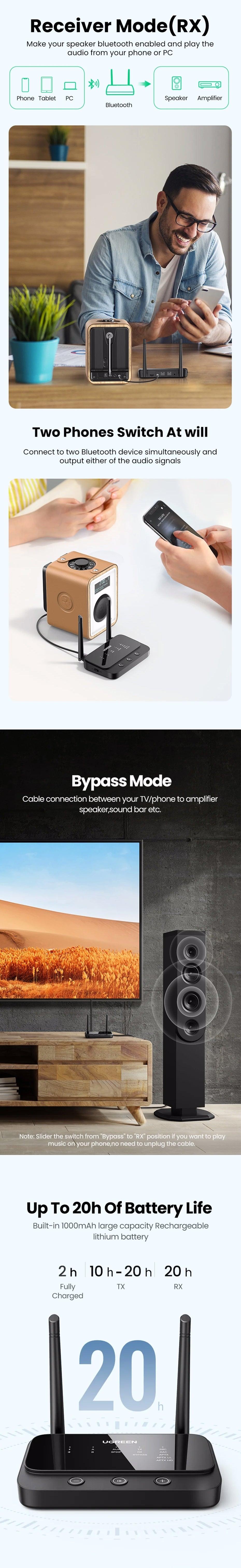 Support One for Two: Connect two Bluetooth speakers/headphones at the same time to share with friends. Receiving mode: Connect two mobile phones at the same time, and switch between the two mobile phones at will. Without any delay in listening to music or watching movies.