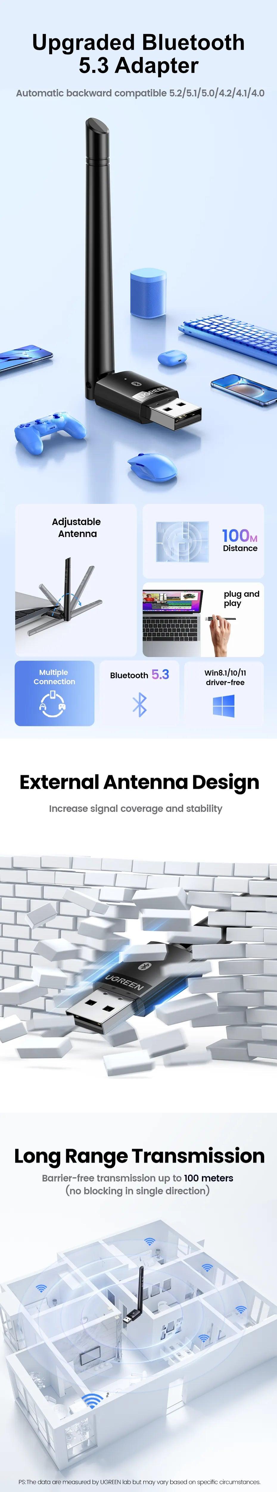 Long Range Bluetooth Adapter: Ugreen V5.3 USB Bluetooth adapter boasts a rapid transmission rate of up to 2Mbps, offering exceptional stability and robust resistance to interference. It can reach a transmission distance of 100 meters in an open environment, with a maximum of 30 meters without obstructions and up to 100 meters in one direction without obstructions.