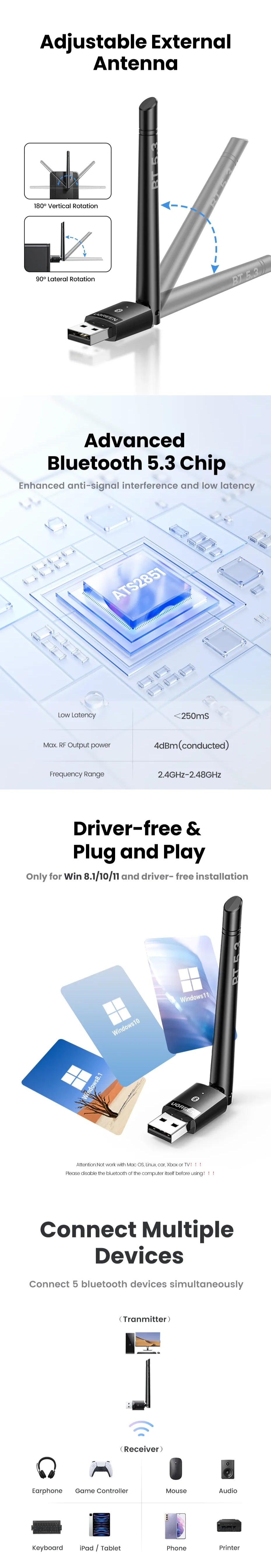 Driver Free, Plug and Play: Bluetooth adapter for laptops and PCs is hassle-free, requiring no additional drivers. It offers seamless plug-and-play functionality for Windows 11/10/8.1.