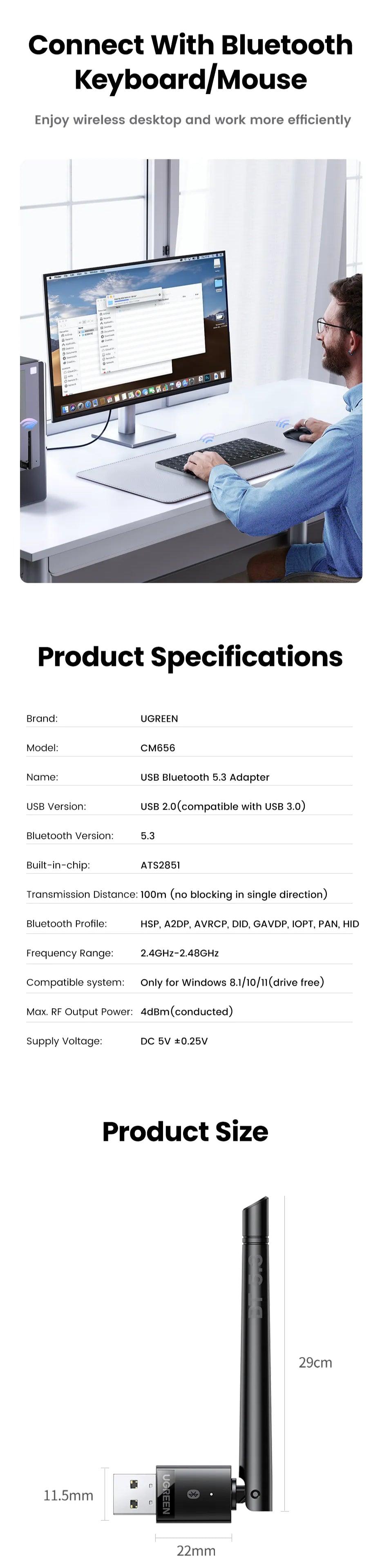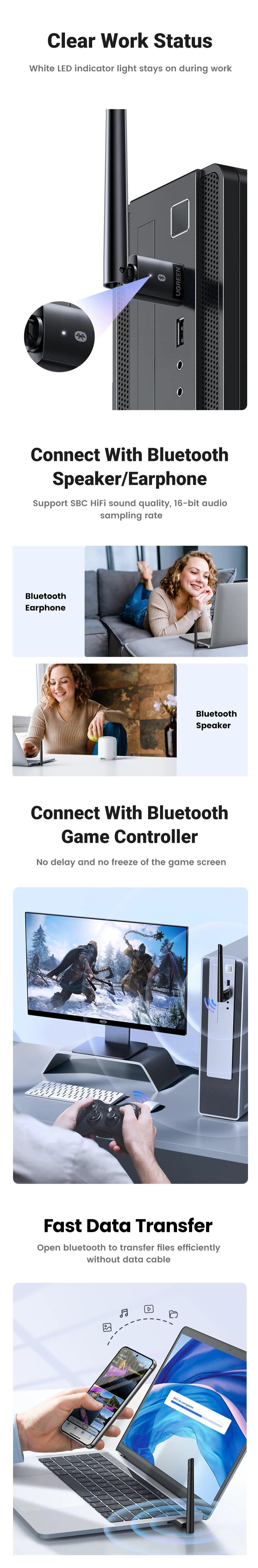 Bluetooth 5.3: Ugreen V5.3 PC Bluetooth Adapter features the latest Bluetooth 5.3 technology, enabling PCs and laptops to effortlessly gain Bluetooth capabilities. This adapter facilitates seamless connections with Bluetooth devices, offering increased transmission speed, improved efficiency, reduced latency, and backward compatibility with Bluetooth versions 4.0, 5.0, 5.1, and 5.2.