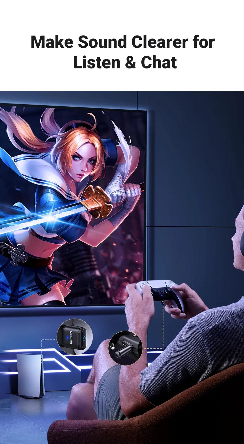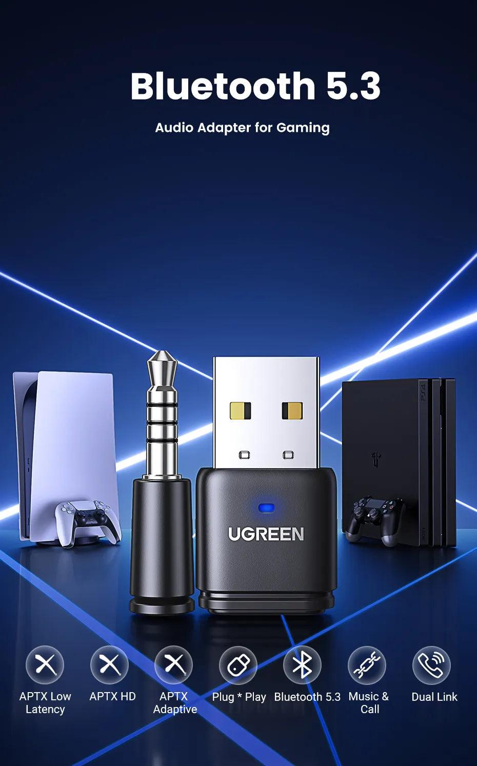 Bluetooth Audio Transmitter: This Ugreen Bluetooth Audio Transmitter, tailored for gaming enthusiasts. This product comprises a Bluetooth transmitter and a 3.5mm microphone connector. Simply insert the USB Bluetooth adapter into the USB port of your PS5, PS4, or Switch, enabling your game console to effortlessly gain Bluetooth functionality, perfect for syncing with your Bluetooth headset during online gaming sessions. For smooth communication with your friends while playing online games, just plug in the 3.5mm microphone into your game controller.
