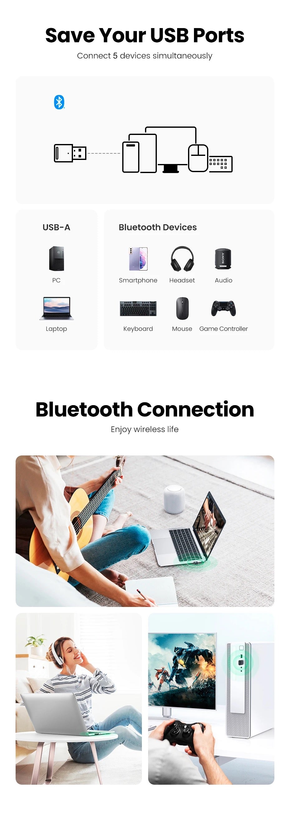 Link 5 Devices Together: With the Ugreen V5.4 Bluetooth network adapter, your PC can establish connections with up to 5 Bluetooth devices at the same time. This includes various peripherals like a Bluetooth mouse, keyboard, headphones, speakers, game controller, printer, as well as smartphones, tablets, projectors, and other BLE (Bluetooth Low Energy) devices.