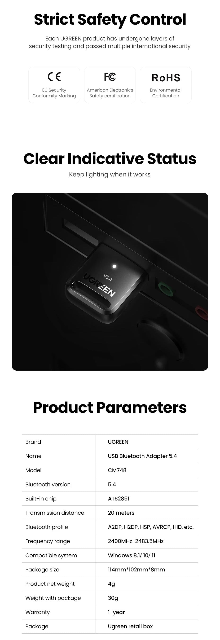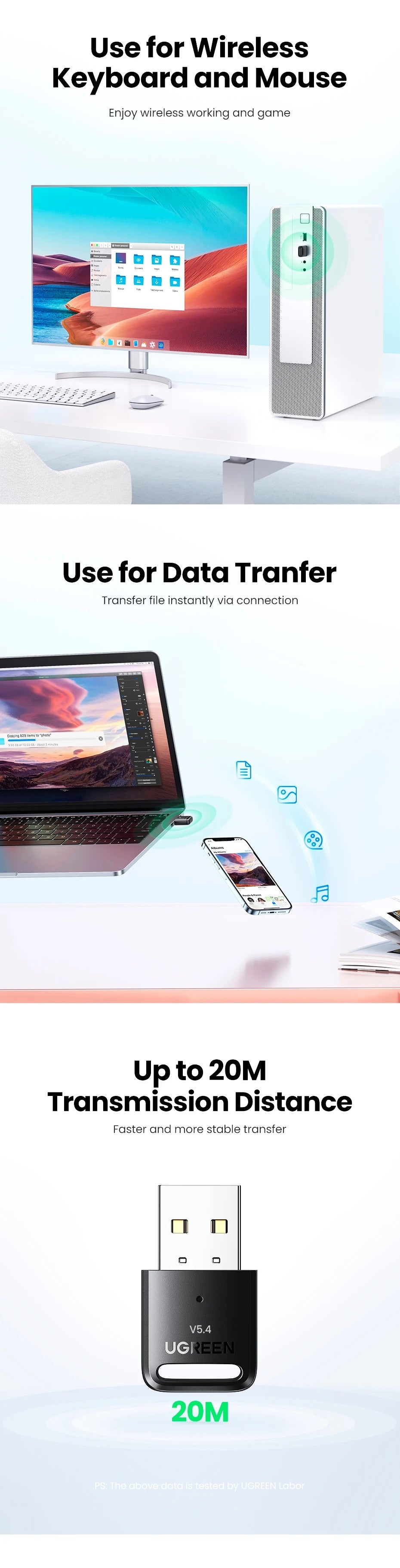 Extensive Operating Capability: The Ugreen V5.4 USB Bluetooth adapter is known for its swift 2 Mbps transmission speed, reliable stability, and robust resistance to interference. It can transmit data up to a distance of 20 meters within an open environment.