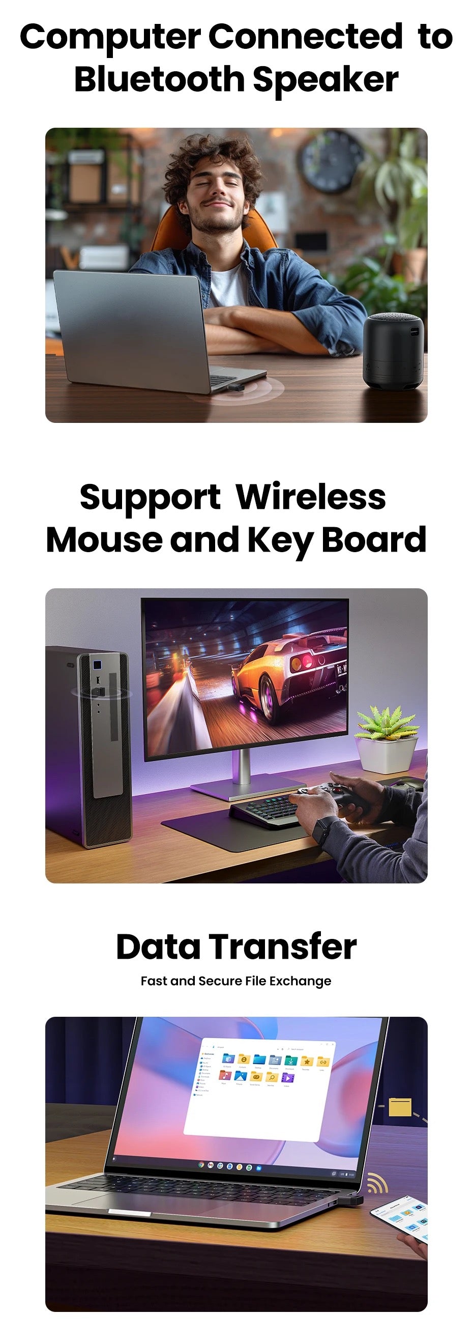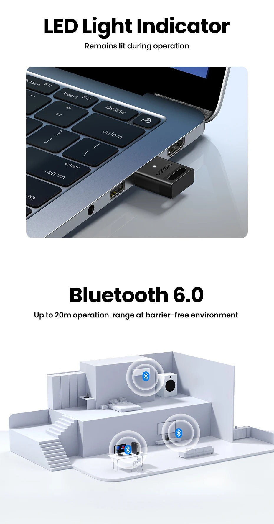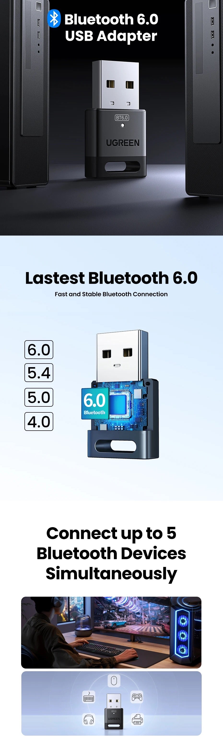 Bluetooth 6.0 Technology for Seamless Connectivity: Upgrade your PC with cutting-edge Bluetooth 6.0! The Ugreen Bluetooth Adapter supports both Bluetooth classic BR/EDR and low-energy BLE modes, delivering faster, more stable connections. With an enhanced anti-interference system, it ensures low latency and efficient wireless performance—perfect for streaming, gaming, and multitasking.