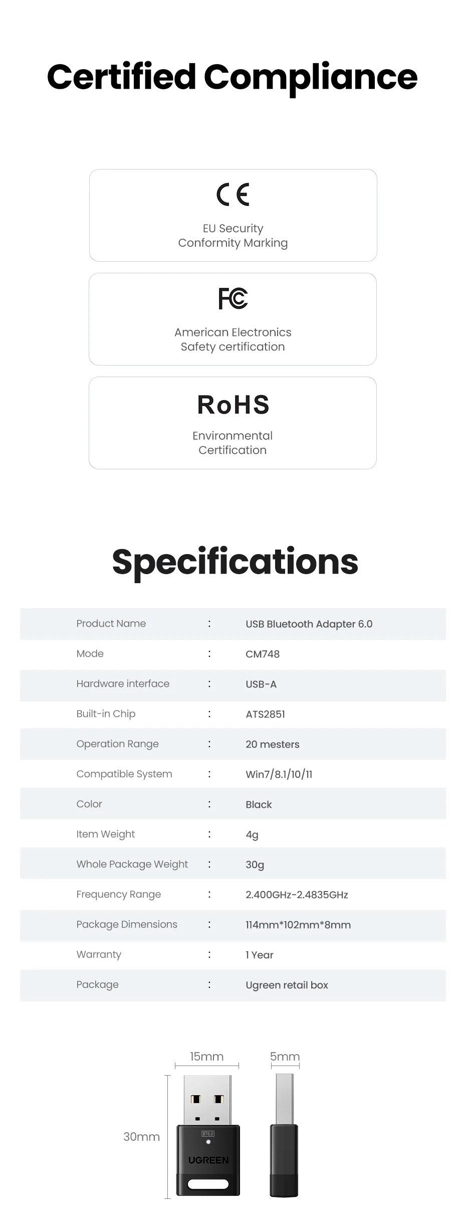 The Ugreen Bluetooth 6.0 Adapter offers a fast, stable connection with both Bluetooth classic and BLE modes, ensuring low-latency performance. It supports simultaneous pairing with up to five devices, including controllers, headphones, speakers, and more. Designed for convenience, this plug-and-play dongle requires no extra drivers for Windows 11/10/8.1. (Note: Driver installation needed for Windows 7; not compatible with macOS or Linux.) Enjoy extended range and strong signal quality in various environments. The compact, 4g mini USB design allows easy portability, making it ideal for both home and travel use.