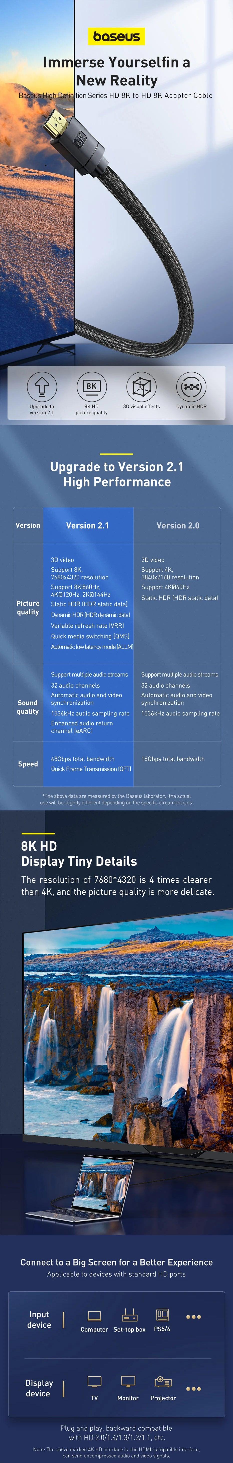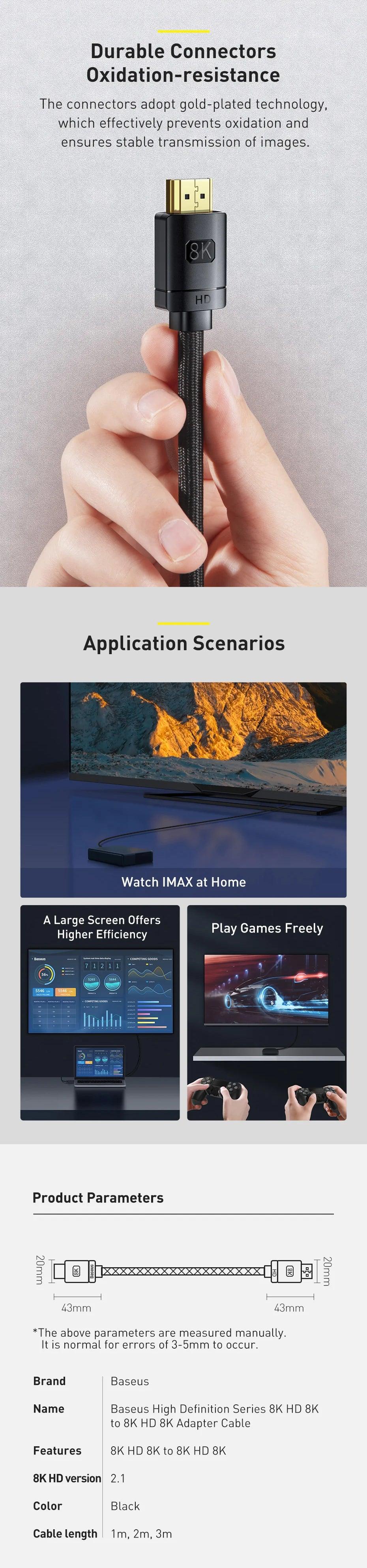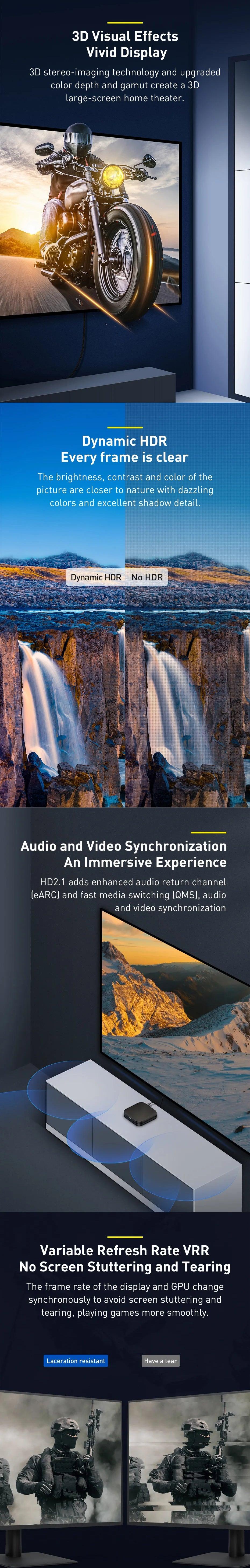 HDR: The Baseus High Definition Series HDMI 8k cable with HDR delivers a heightened visual experience, boasting dynamic HDR for vivid images. It supports Dolby Vision HDR, HDR 10+, and more, ensuring superior picture quality. Additionally, it offers impeccable audio fidelity, allowing you to enjoy enhanced audio through features like the Enhanced Audio Return Channel. This enables the utilization of advanced sound formats like Dolby Atmos, providing immersive object-based surround sound.