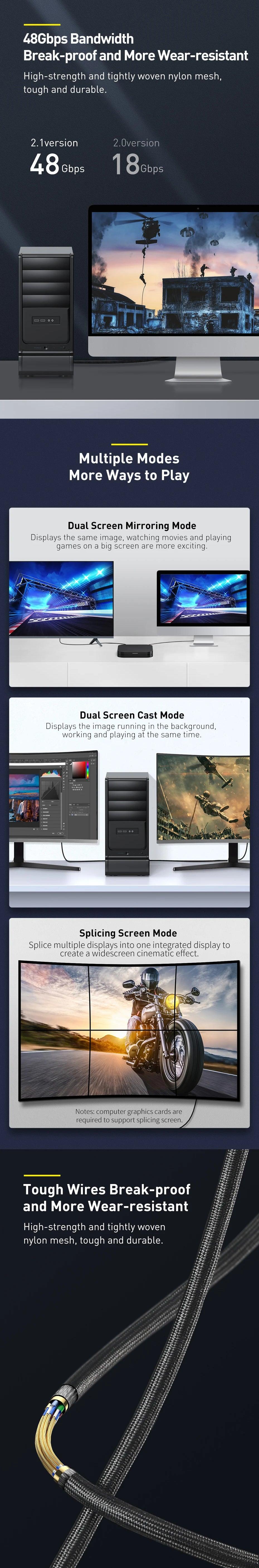 Experience high-performance gaming and ultra HD video streaming with the Baseus 8K High-Speed HDMI Cable. Supporting resolutions up to 8K@60Hz and compatible with 4K@120Hz and 1080P, it ensures a vivid gaming experience. With HDMI 2.1 and a data transfer speed of up to 48Gbps, enjoy smooth picture and video transmission, enhanced by dynamic HDR including Dolby Vision HDR and HDR 10+. Benefit from Dolby Atmos support for immersive audio, and features like Variable Refresh Rate for smoother gameplay. Backward compatible and suitable for various devices including MacBook Pro, Apple TV, PlayStation, and more, this cable delivers top-tier performance.