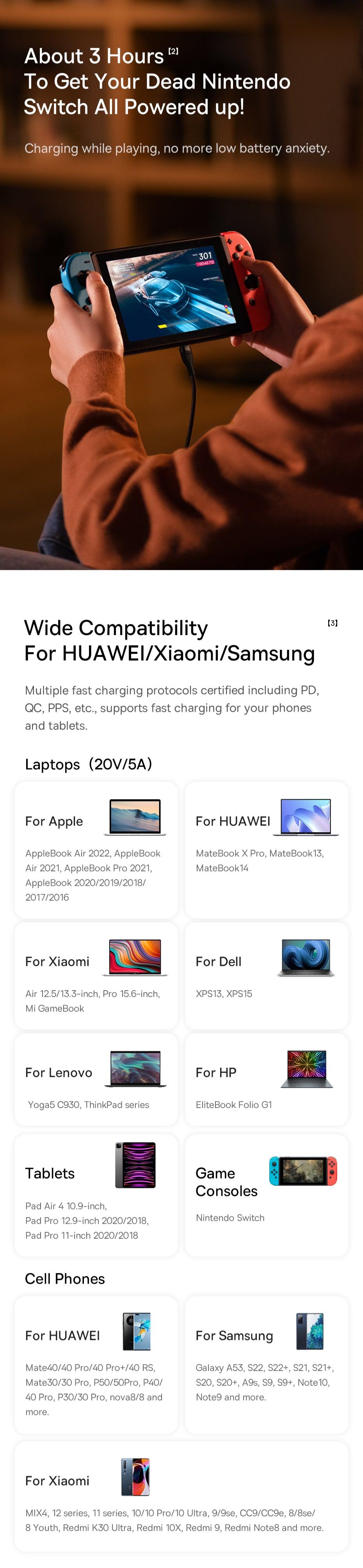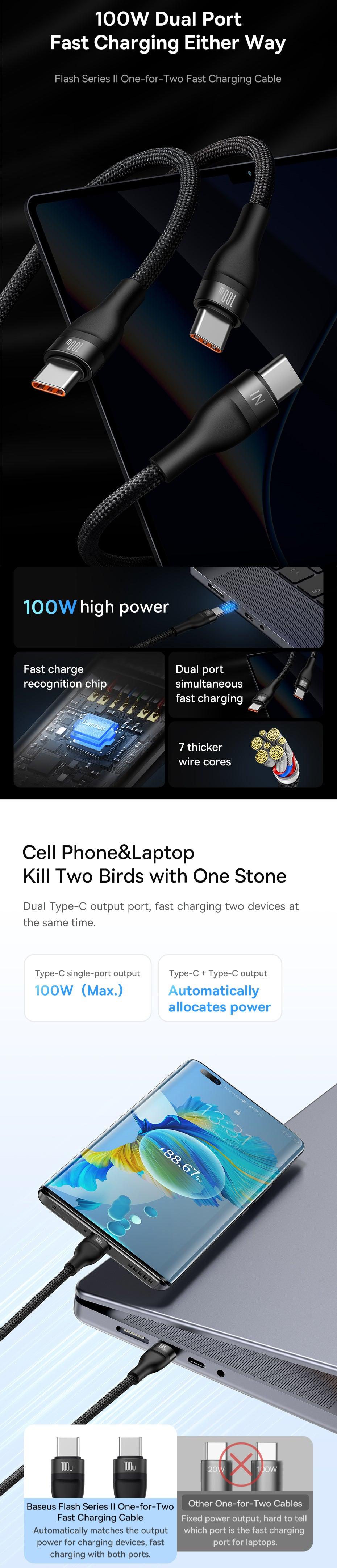 100W High Power: Baseus Flash Series II One-for-Two Fast charge mobile phones and laptops, satisfy the need for games, work, and watching soap operas.