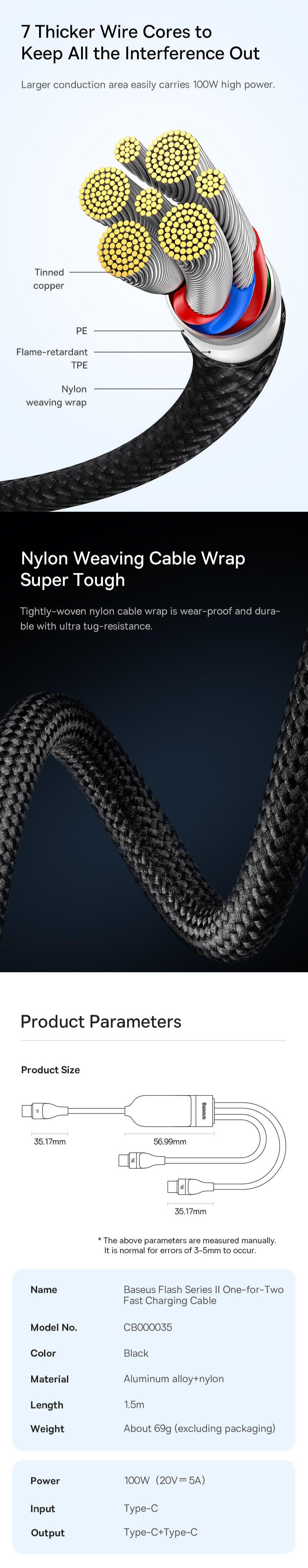 Baseus Flash Series II One-for-Two 100W high-power charger offers rapid charging for mobile devices and laptops, catering to gaming, work, and entertainment needs. It utilises recognition chips for smart current and voltage allocation across ports, ensuring safe fast charging. Featuring seven thickened cores for enhanced conduction, it effortlessly handles high-power demands. Its nylon weaving cable wrap enhances flexibility and durability, making it a reliable choice for efficient charging solutions.