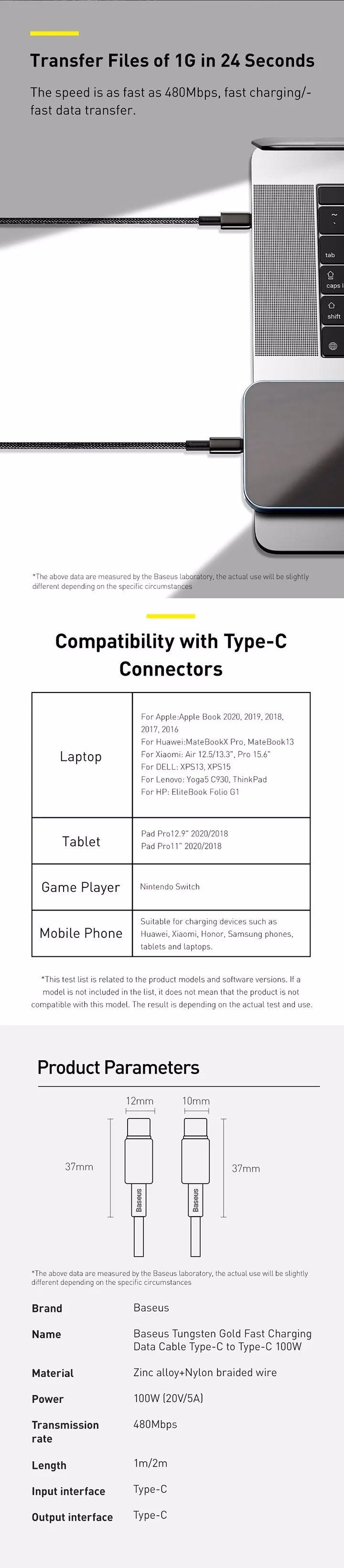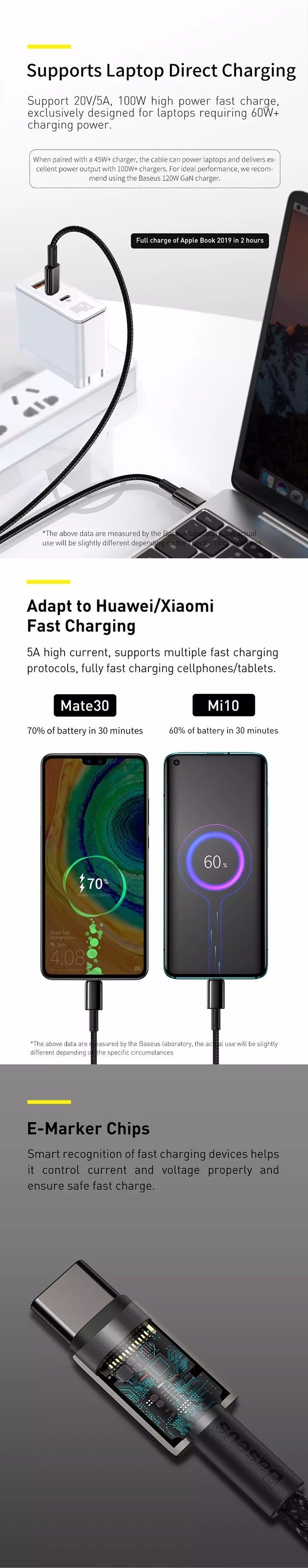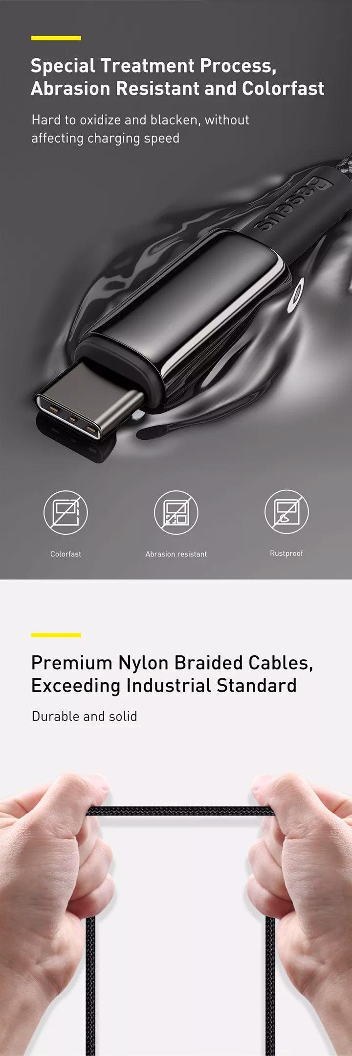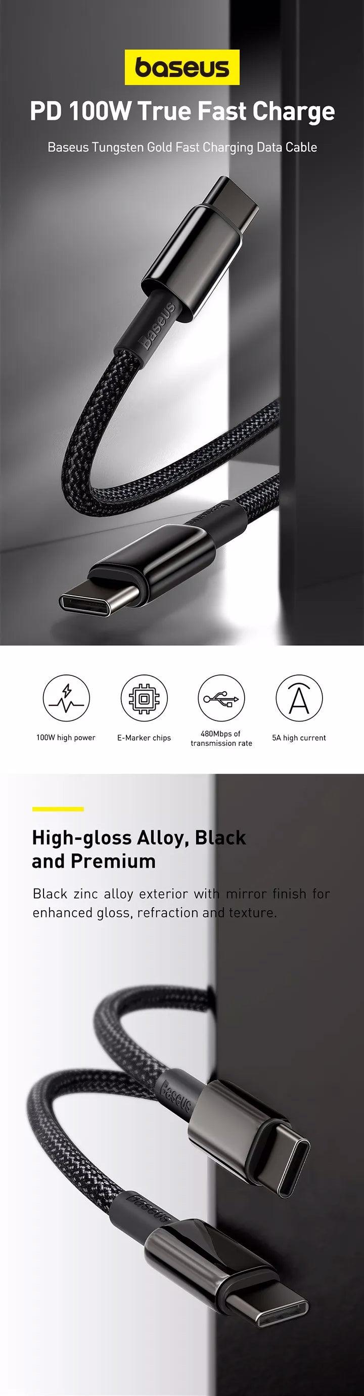 Experience high-speed charging with Baseus Tungsten 100W high-power charge cable, perfect for mobile phones and laptops. Equipped with E-Marker chips for smart device recognition, it ensures safe and efficient fast charging. The sleek black high-gloss zinc alloy design adds a touch of sophistication, while the nylon braided cable offer durability for long-term use. With a 480Mbps transmission rate, it's not just fast charging but also has data transfer. Meet all your gaming, work, and entertainment needs with this versatile charging solution.