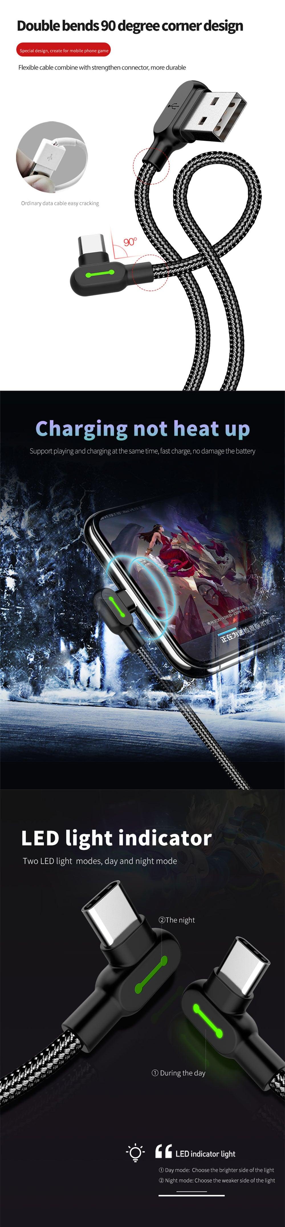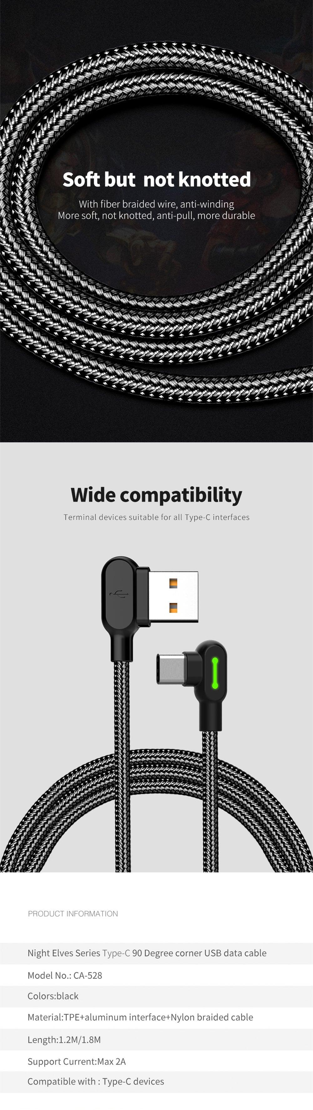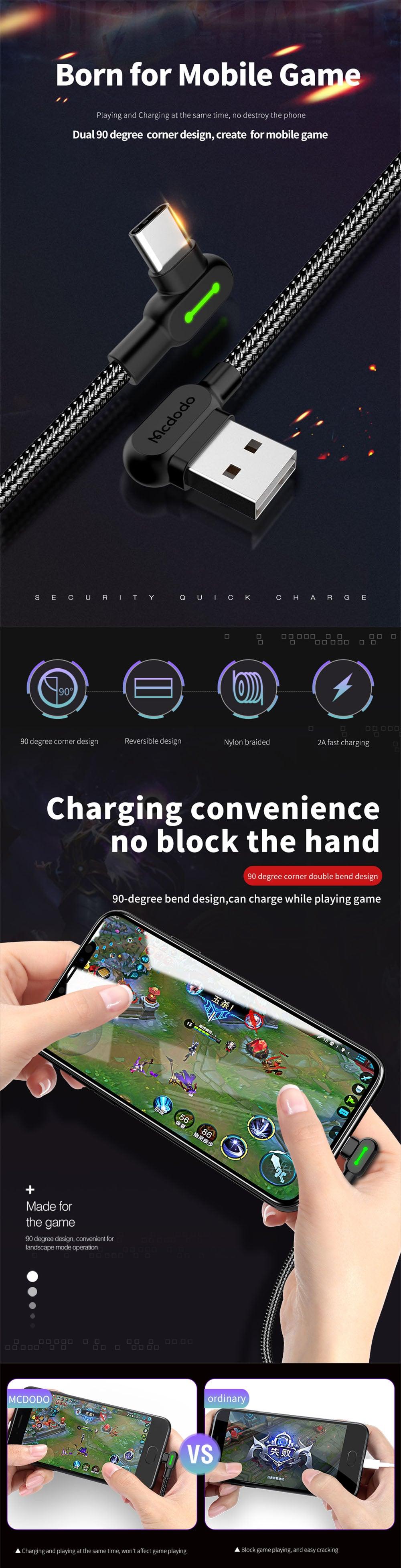 Mcdodo Button Series innovative Right Angle 90 Degree USB-C Cable, featuring a sleek L-shaped design with green LED lighting. This cable enhances your comfort and convenience for gaming, video watching, and reading in bed or on the couch while charging. Crafted from high-quality nylon braided cord, it withstands over 15,000 bends, guaranteeing durability and longevity, while its anti-scratch and anti-oxidation properties ensure lasting quality. With high-quality copper wire, it supports fast charging up to 3A and data transfer speeds of up to 480Mbps for Type C devices.