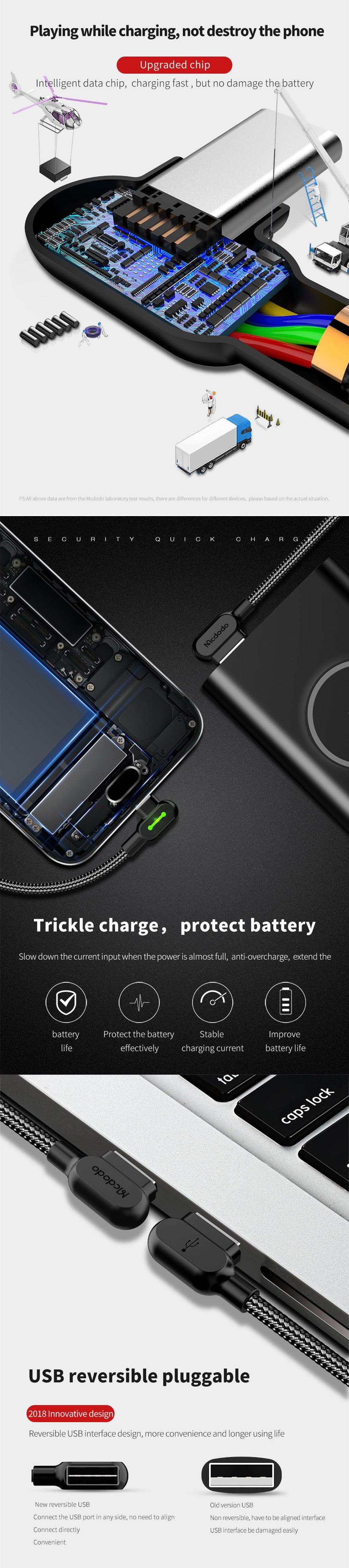 Right Angle 90 Degree Cable: Mcdodo Button Series Cable with innovative 90-degree L-shaped cable with a stylish green LED light design. Experience enhanced convenience and comfort while gaming, watching videos, or reading e-books, even when you're relaxing on the couch or in bed while charging.
