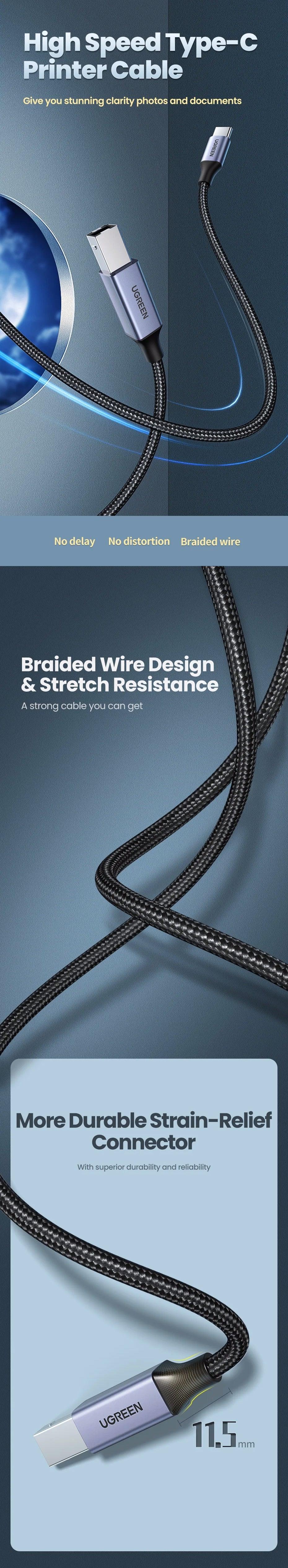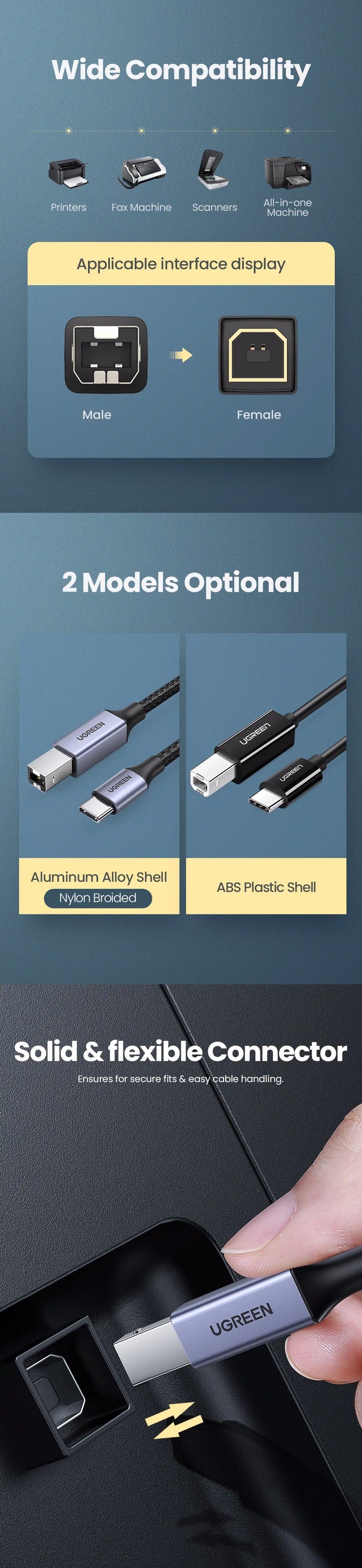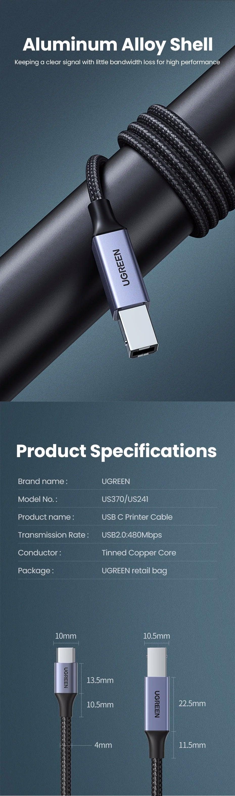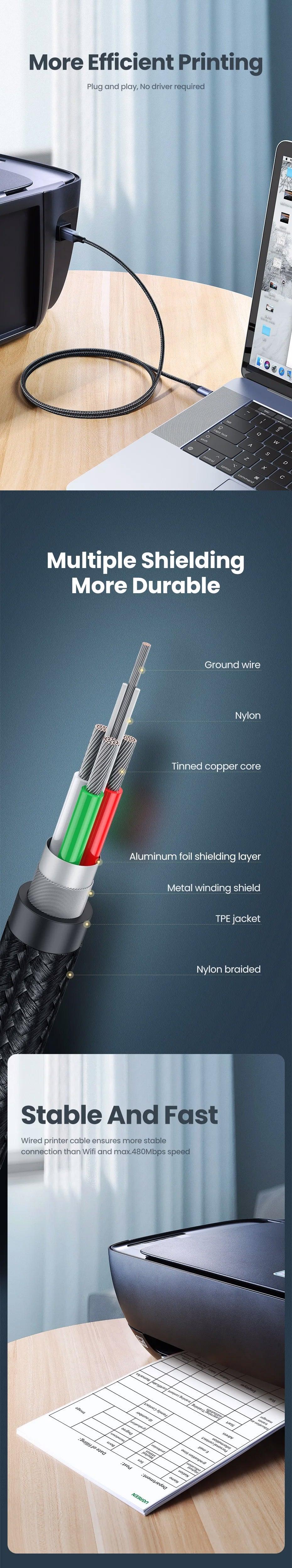 Ugreen USB-C to USB-B printer cable, the ultimate solution for seamless connectivity between USB-C equipped laptops or PCs and USB-B compatible printers, scanners, or fax machines. With plug-and-play functionality, no drivers or programs are required. Compatible with a wide range of devices including New MacBook, Chromebook Pixel, and more for USB-C, and printers or scanners from Brother, Canon, HP, and others for USB-B. Its triple shielding ensures durability and connectivity, while the high-speed 480Mbps transfer rate facilitates rapid file and photo transfer. The reversible Type C connector eliminates orientation confusion, providing hassle-free plugging.