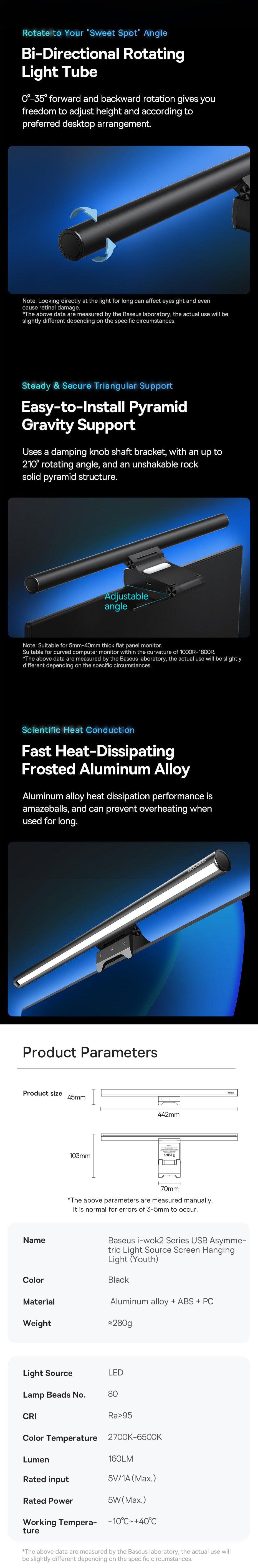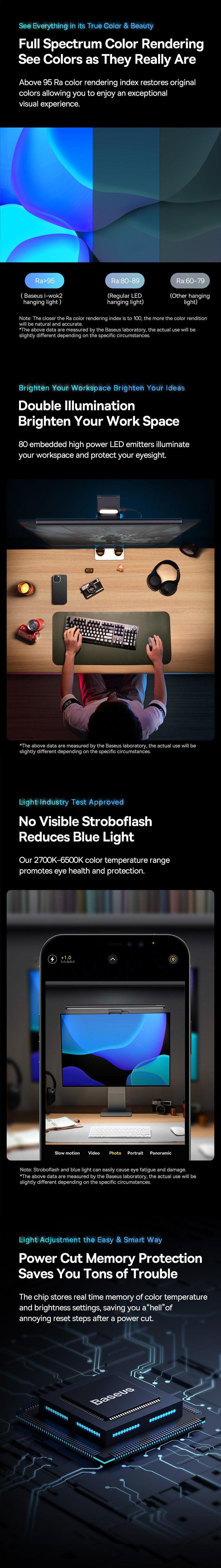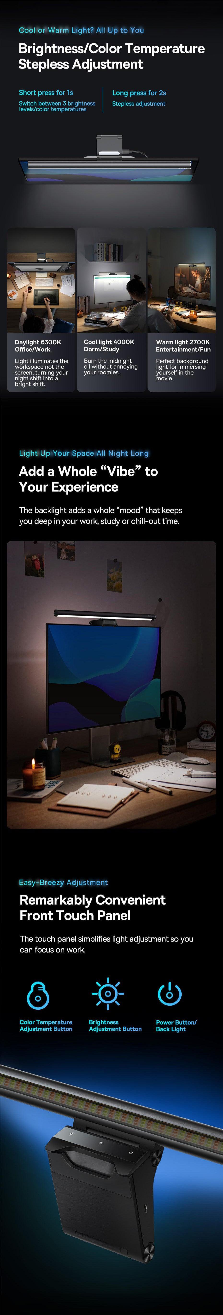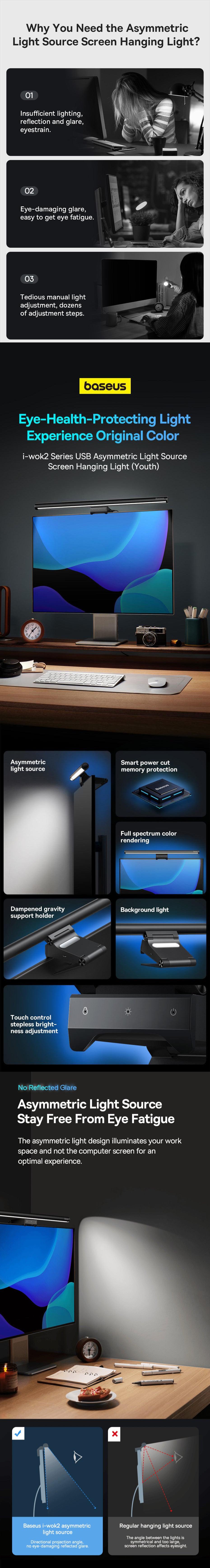 Baseus i-wok2 Series innovative lighting solution offers Smart Memory After Power-off, ensuring it remembers your preferred brightness and colour temperature settings when turned off. Its adjustable features allow you to easily customise both brightness and colour temperature through simple button presses and long-press for seamless adjustments. With an Asymmetric Light Source, it eliminates screen glare and reflections. Additionally, the Backlight Design allows you to create a cozy and calming evening ambiance by enabling soft backlighting.