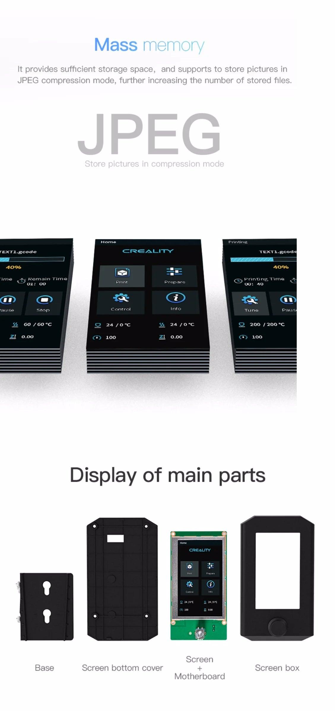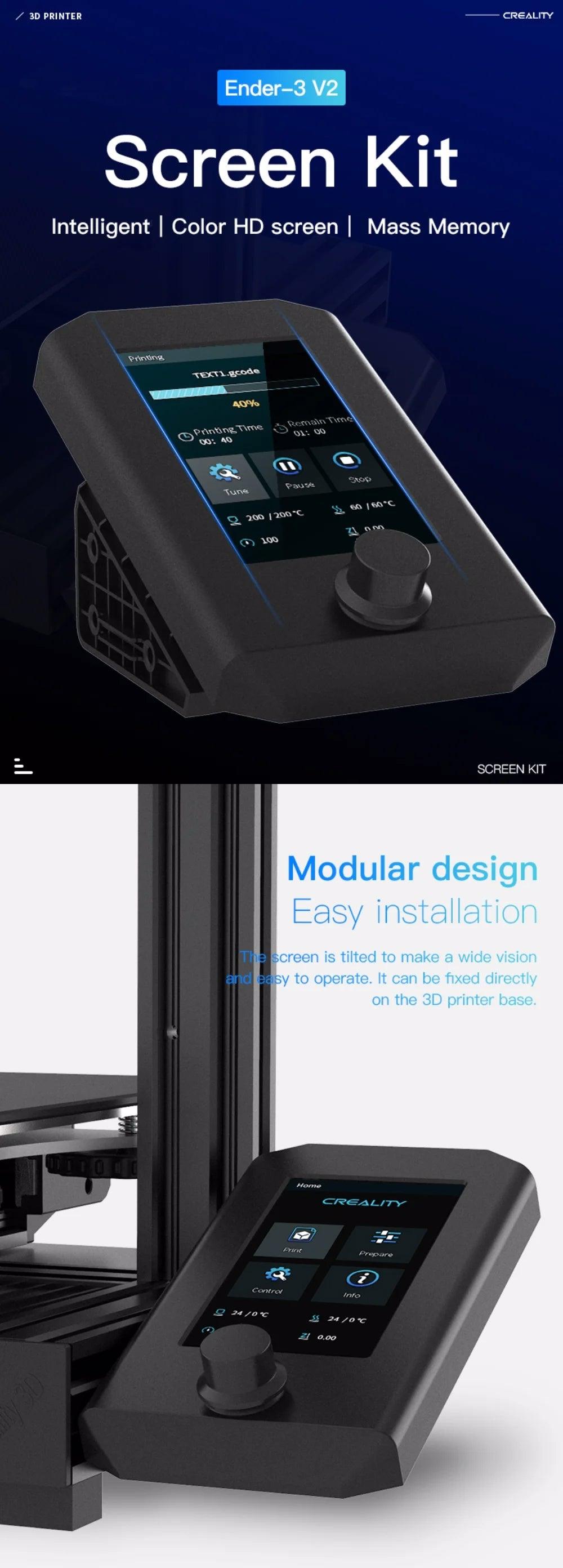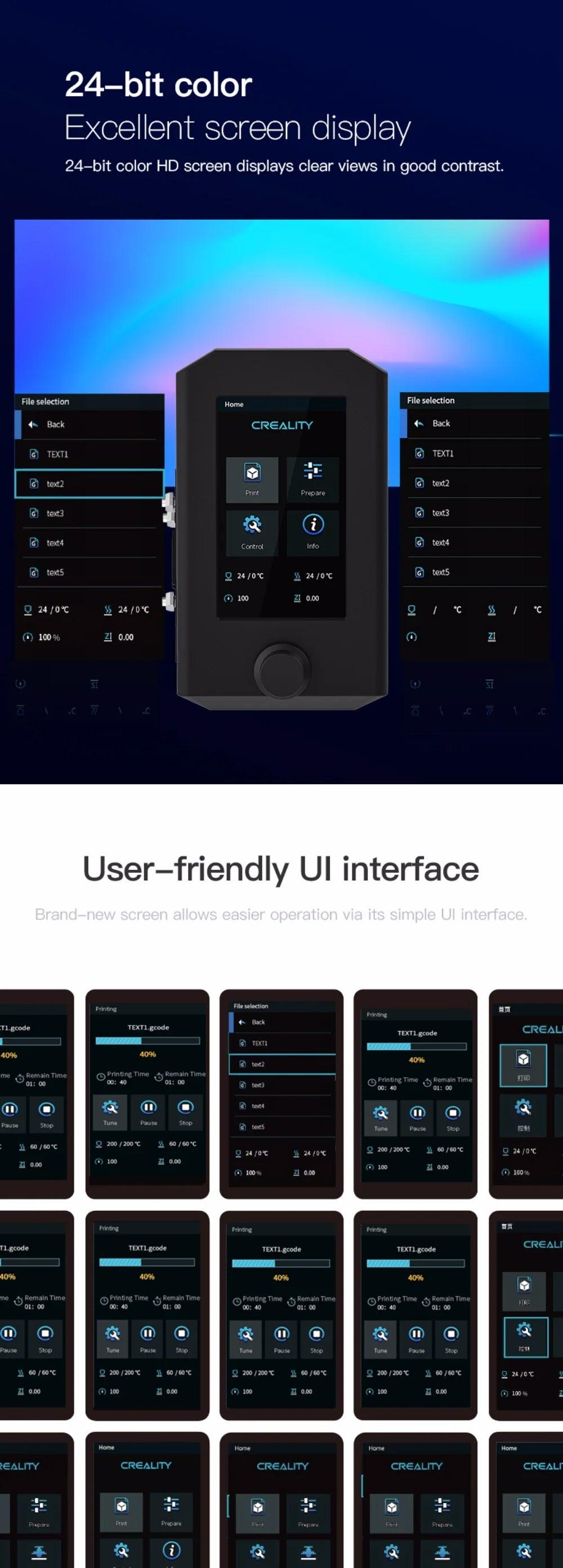 Creality enhanced screen kit for 3D printers, featuring a brilliant 24-bit colour HD display with intelligent capabilities. The tilted design ensures a wide vision and effortless operation, easily attaching to the 3D printer base. Its user-friendly interface simplifies navigation, while the ample mass memory supports JPEG compression for expanded file storage. Specifically tailored for 32-bit motherboard printers, it's perfect for Ender 3 V2. With firmware updates, compatibility extends to Ender 3 and Ender 3 Pro.