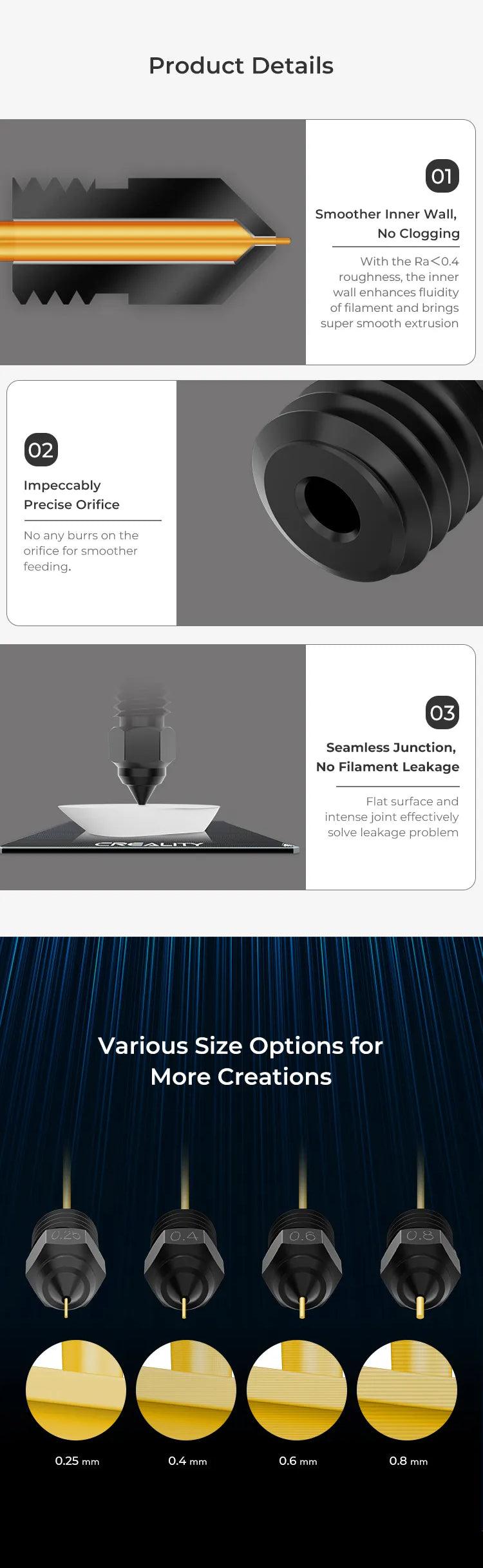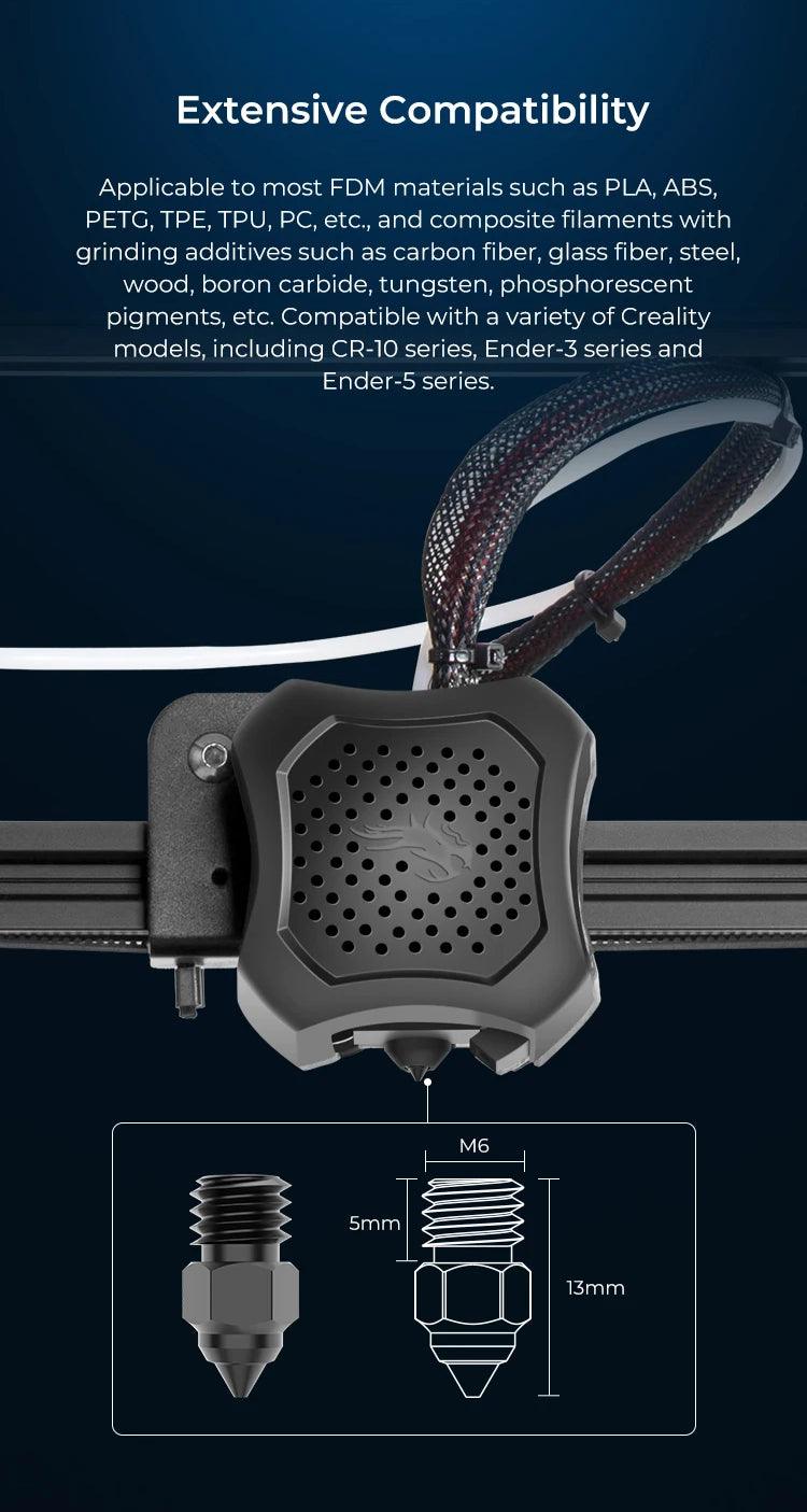 Comprehensive Compatibility: Creality nozzles are compatible not only with widely used printing materials like PLA, ABS, PETG, TPE, TPU, PC, and more but also with composite filaments containing grinding additives such as carbon fibre, glass fibre, steel, wood, boron carbon, tungsten, photosensitive fragments, and others.