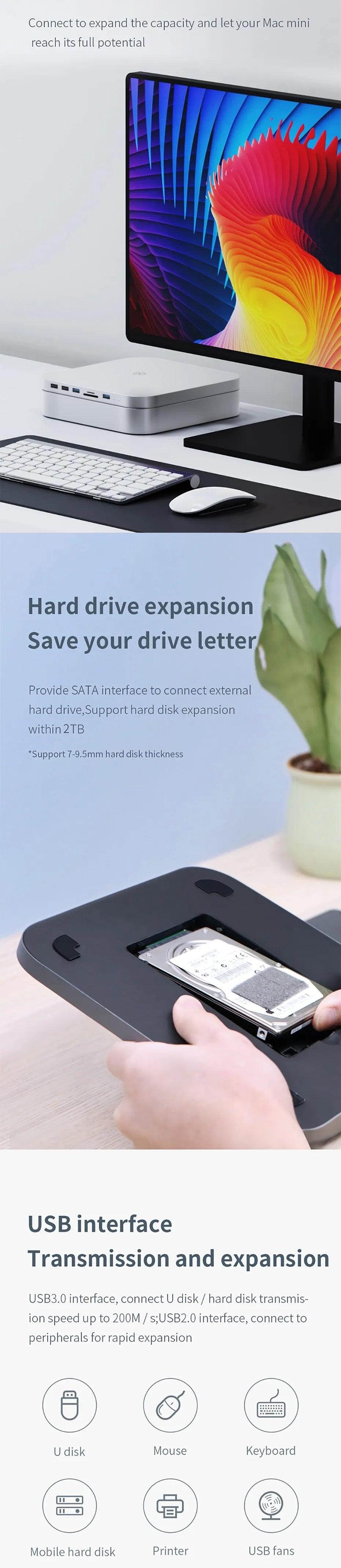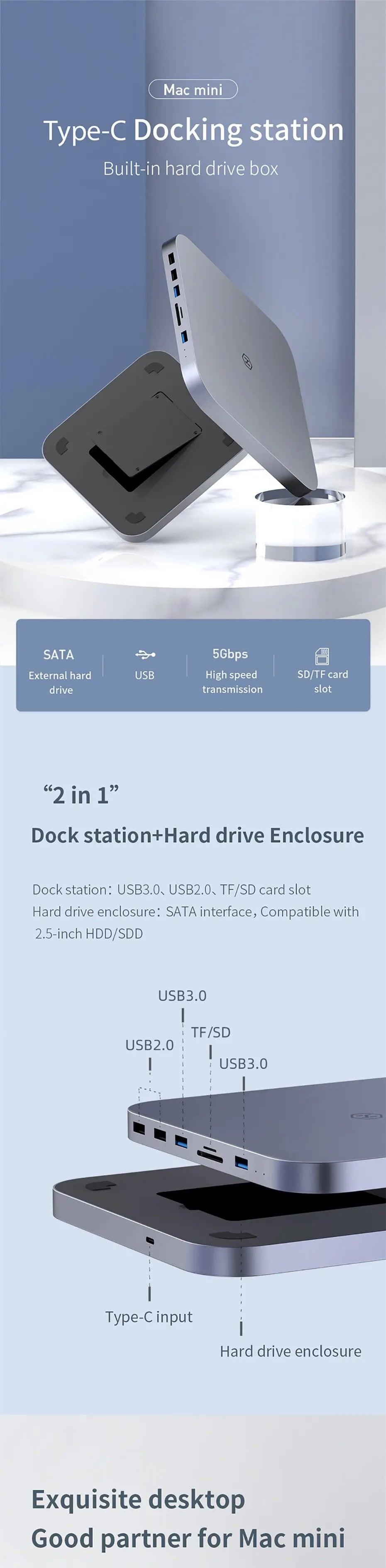 The Hagibis MC25 Pro Mac mini Hub, your perfect companion for the Mac mini. Crafted from alloy material, this hub seamlessly integrates with your Mac mini, offering plug-and-play convenience. Its compact size belies its versatility, boasting multiple interfaces including M.2 NVMe/NGFF, 2.5inch SATA hard drive enclosure, 10Gbps USB3.1 Gen2, 10Gbps USB-C, and 5Gbps USB3.0, along with SD/Micro SD card slots. With dual hard drive enclosure design supporting simultaneous read/write operations, it's ideal for storage expansion. Camera enthusiasts will appreciate its fast SD/TF card read/write capabilities. Enjoy lightning-fast 10Gbps transmission, though speeds may vary on Apple M1 chip systems.