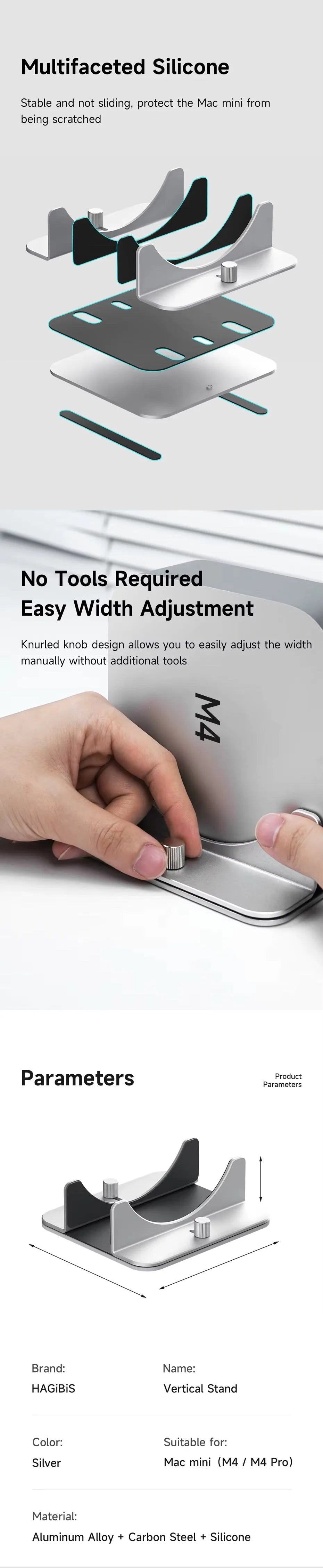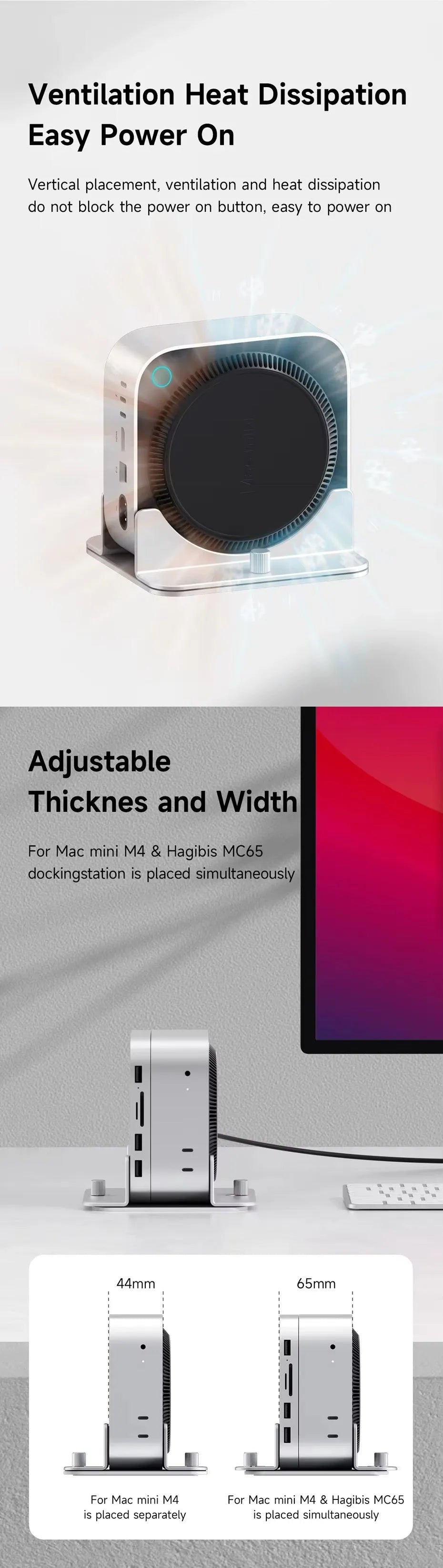 The Hagibis vertical stand is designed for the Mac Mini M4, offering a sleek and precise fit. With an adjustable width range of 1.73-2.56 inches, it accommodates the Mac Mini M4 and Hagibis MC65. The knurled knob design allows for easy manual adjustment without tools. Multifaceted silicone ensures stability and prevents scratches. Made of durable alloy, the stand keeps the Mac Mini upright for a cleaner, more organised workspace while enhancing heat dissipation. Combining functionality and aesthetics, this stand is a practical accessory for Mac Mini M4 users.