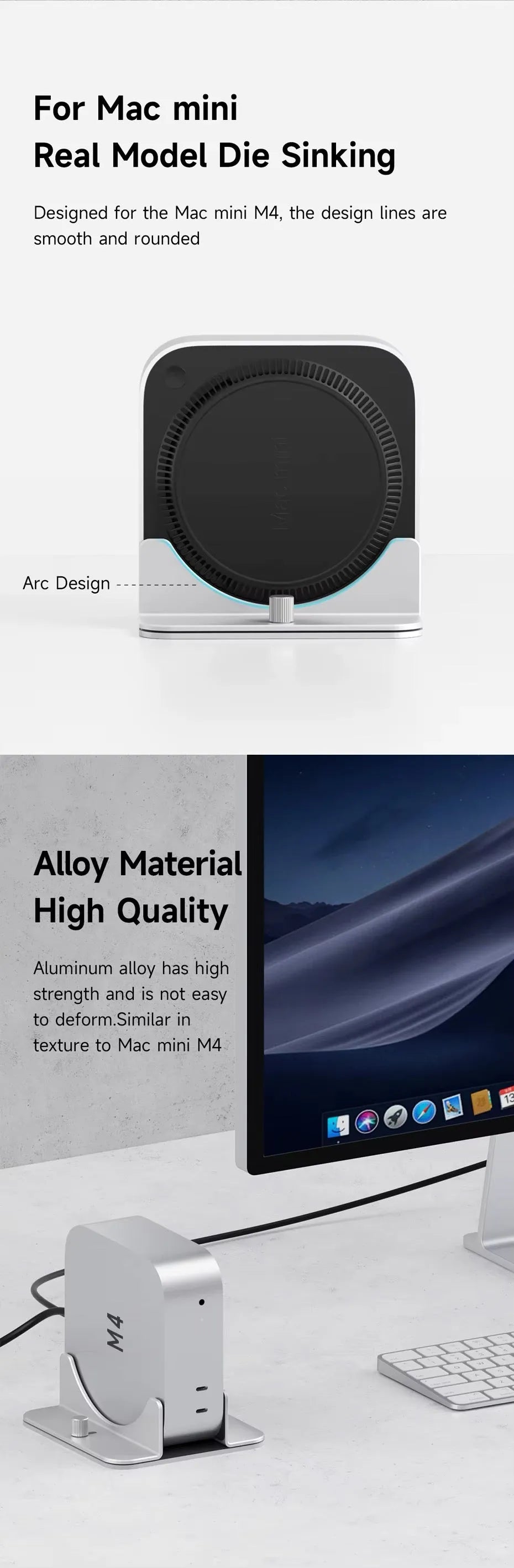 Alloy Material: The Mac mini M4 rests on the aluminium vertical stand, keeping your desktop clean and organised while enhancing both cooling efficiency and aesthetics.