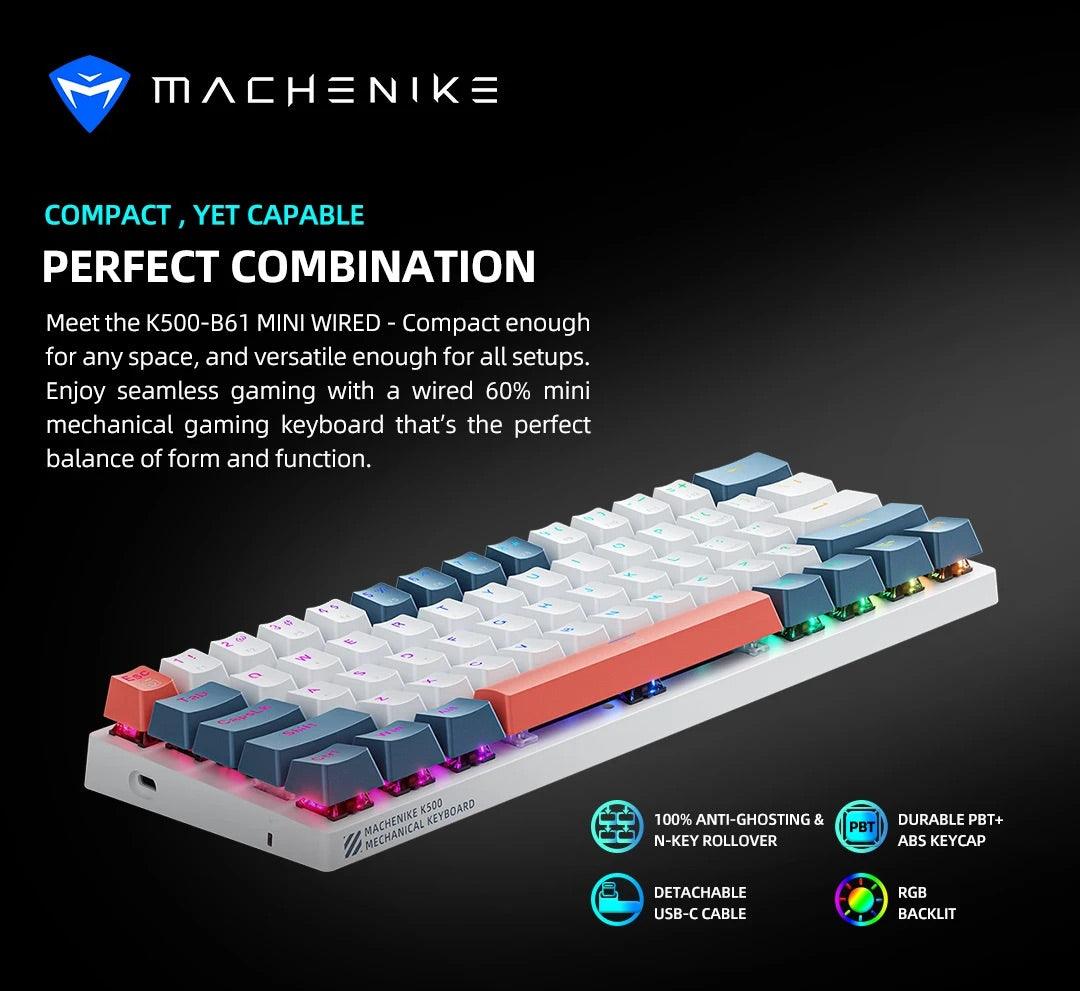 60% Compact, 100% Powerful: The Machenike K500-B61 Mechanical Keyboard features a sleek 61-key US layout that preserves full keyboard functionality while significantly minimising desktop space usage. With a wired connection through a detachable USB-C cable, it offers easy plug-and-play convenience, making it highly portable.