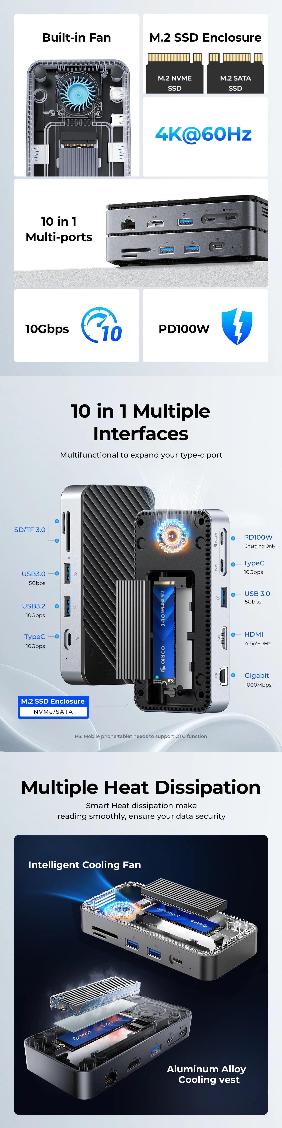 ORICO 10-in-1 USB C Docking Station with 10Gbps M.2 NVMe SSD Enclosure, Built-In Cooling Fan