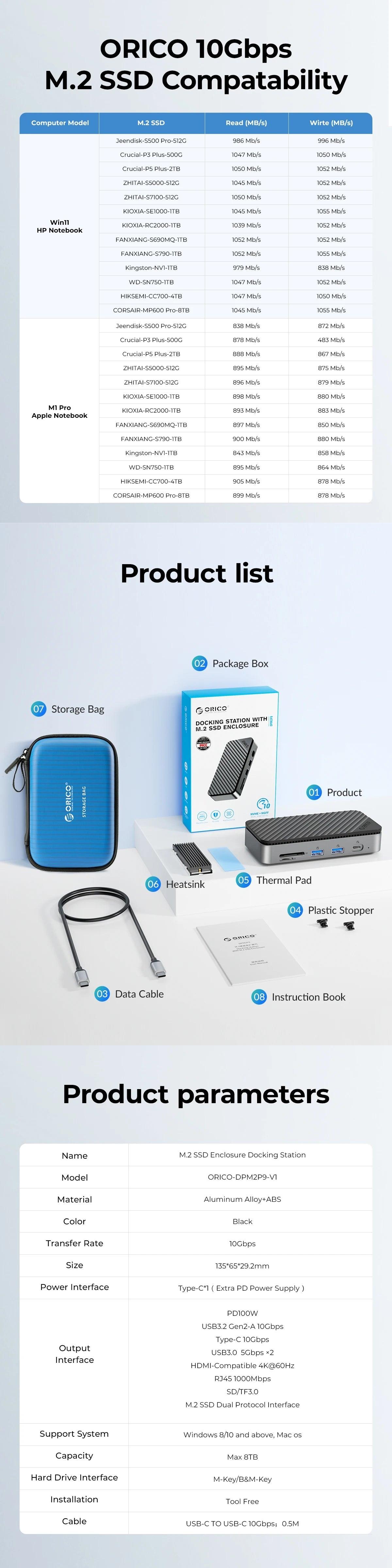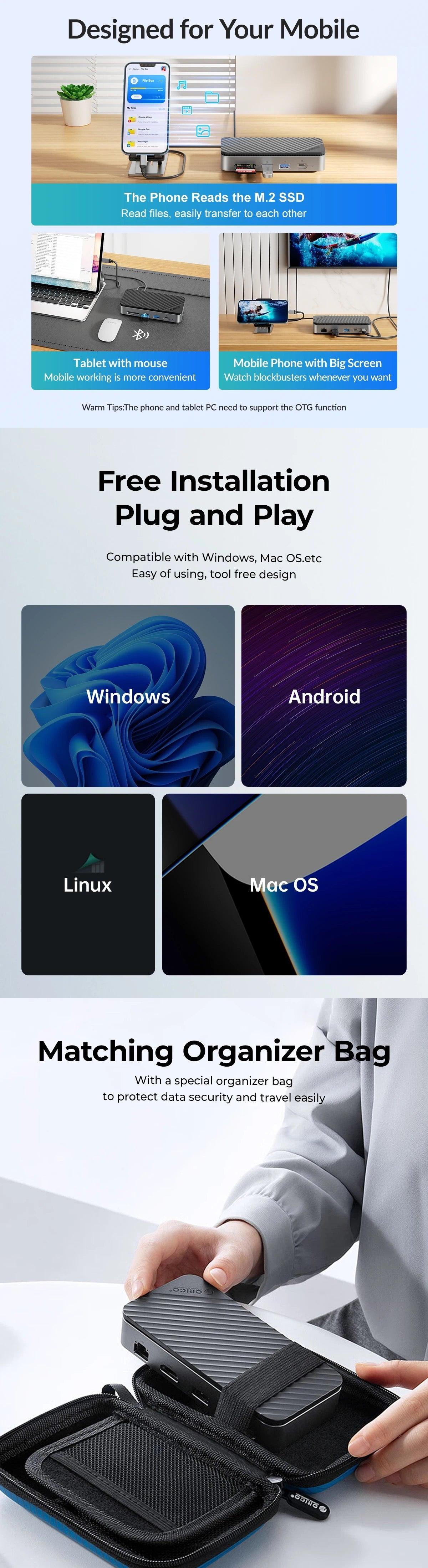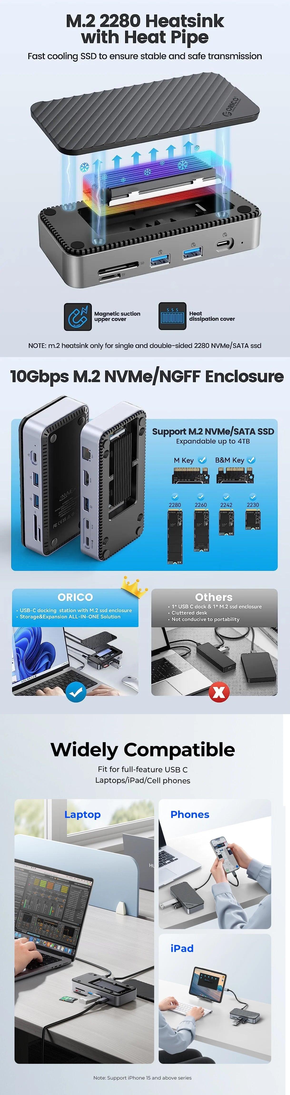 The ORICO USB-C Docking Station with M.2 SSD Enclosure, a versatile solution merging M.2 SSD expansion with a USB hub. Compatible with M.2 NVME and SATA SSDs, it supports various sizes for storage expansion on Windows, Mac OS, Linux, and Chromebook OS. The hub boasts USB 3.2 Gen2 10Gbps speeds, facilitating lightning-fast data transfers and includes USB-A and USB-C ports, along with PD100W charging capability. Featuring a 4K HDMI display output, Gigabit Ethernet, and SD/TF card readers, it enhances productivity and connectivity. With added cooling and tool-less SSD installation, it's a comprehensive solution for efficient and convenient computing.