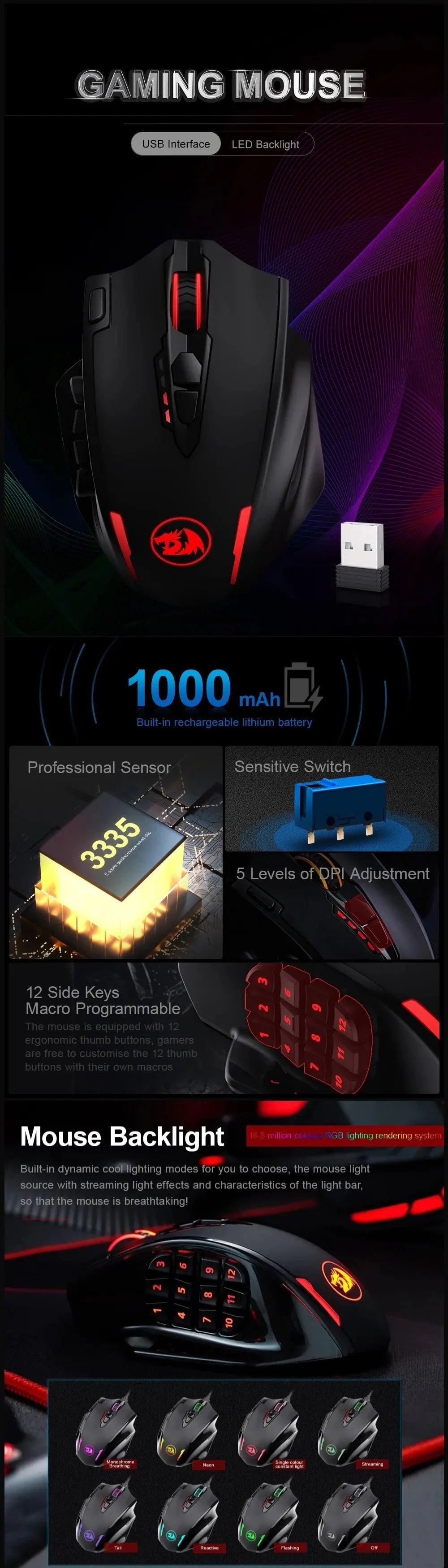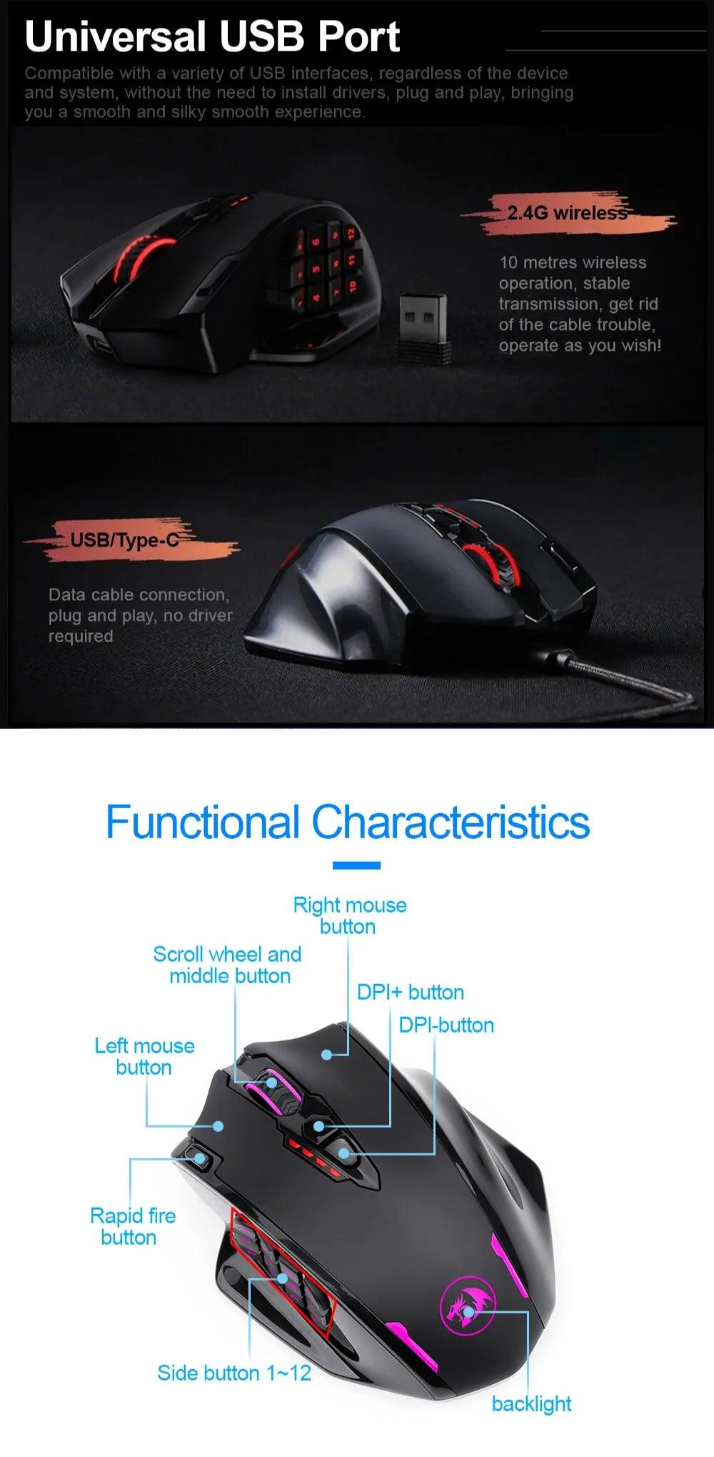 Dual Functionality: This MMO gaming mouse offers the flexibility of two modes - seamless 2.4GHz wireless and convenient USB-C wired connections, all accompanied by a set of 12 side buttons. Switch between wireless and wired modes with ease, and leverage quick-access key-bindings to optimize your damage output.