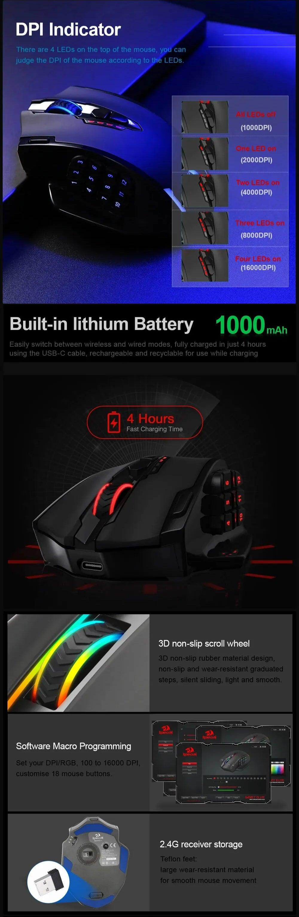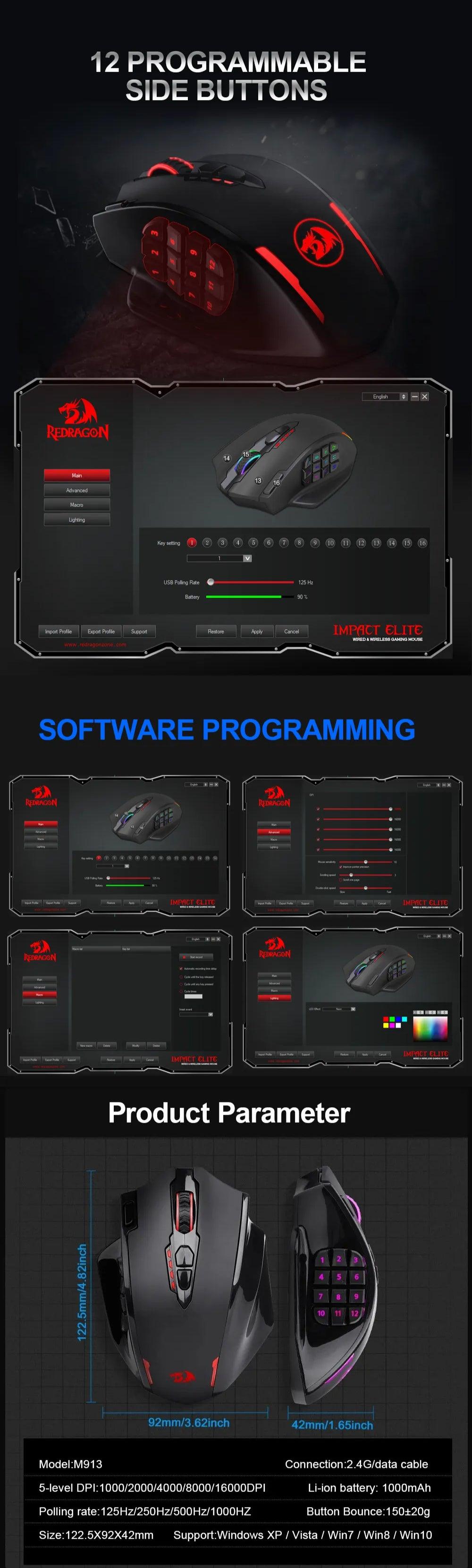 Redragon M913 Impact Elite RGB MMO Wireless Gaming Mouse with Side Buttons