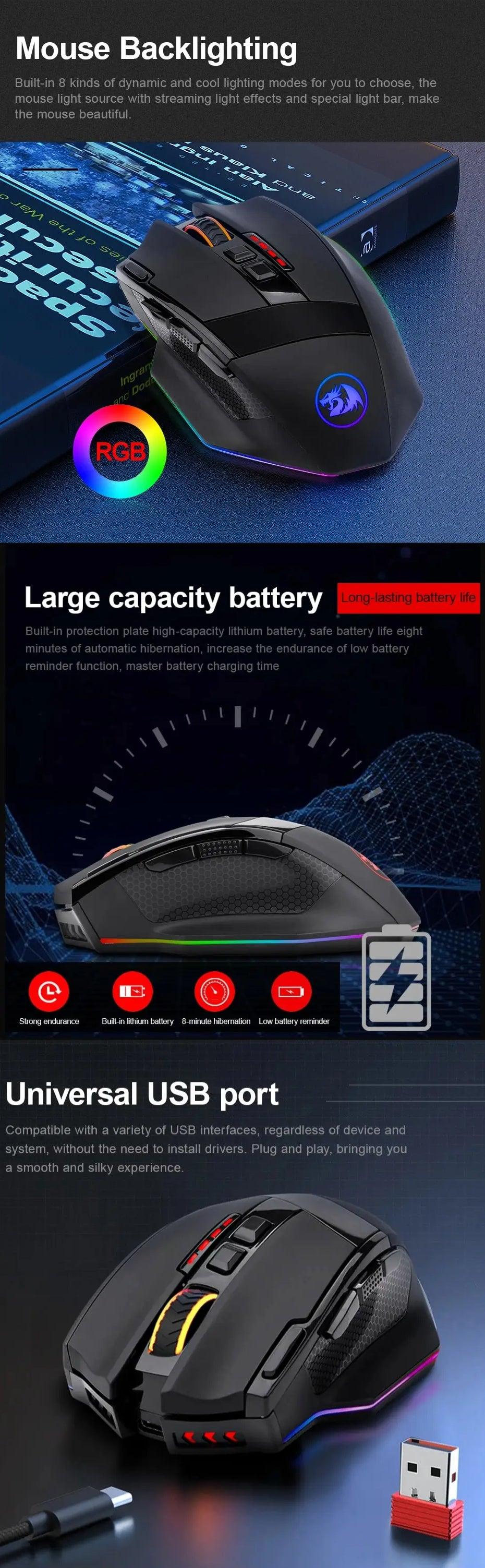 Redragon M801P RGB Gaming Mouse, a wired/wireless powerhouse. With lag-free connections, this rechargeable mouse boasts up to 70 hours of battery life, 16000 DPI, and 40G acceleration. Its RGB backlight offers 8 effects, 10 brightness levels, and 9 programmable buttons for a personalised gaming experience. The ergonomic design ensures comfort and precision, perfect for FPS and MMO games. It also features an anti-skid scroll wheel, durable Teflon feet, and a 6-foot USB-C cable. Compatible with Windows and some Mac OS, it's a great fit for gaming computers and laptops.