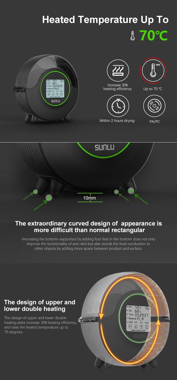 360° All-Round Heating: SUNLU S2 filament dryer box features 360° all-around heating with double heat sinks made from environmentally friendly PC material. This ensures even heating throughout the box, with a temperature range of 35-70℃, resulting in a 30% increase in efficiency. The upgraded SUNLU Filadryer S2 now includes a time setting range of 1 to 99 hours. Experience uniform heat circulation inside the box, minimizing the temperature difference to less than 1℃ across different points of heating filaments.