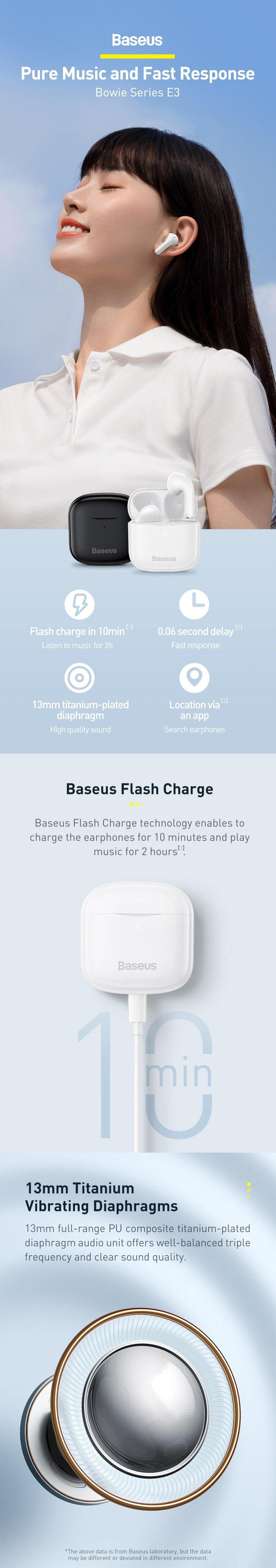 13mmPU+Titanium Moving Coils: The Baseus earphones E3 features 13mm full-range PU composite titanium-plated diaphragm audio unit offers stunning thick bass, well-balanced triple frequency and soft voice.