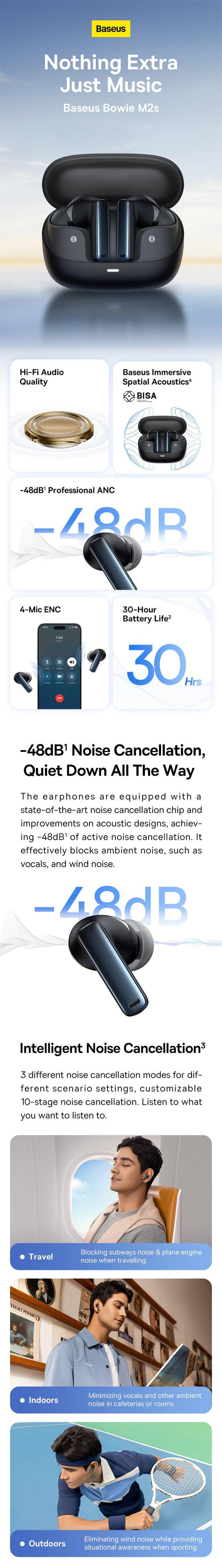 Noise Reduction: The Baseus earphones M2s offer powerful active noise cancellation, minimising noise by up to -48 dB for clear sound. They include Travel, Indoors, and Outdoors modes to block subway sounds, reduce cafe chatter, and cut wind noise in sports. Customise settings for the best listening.