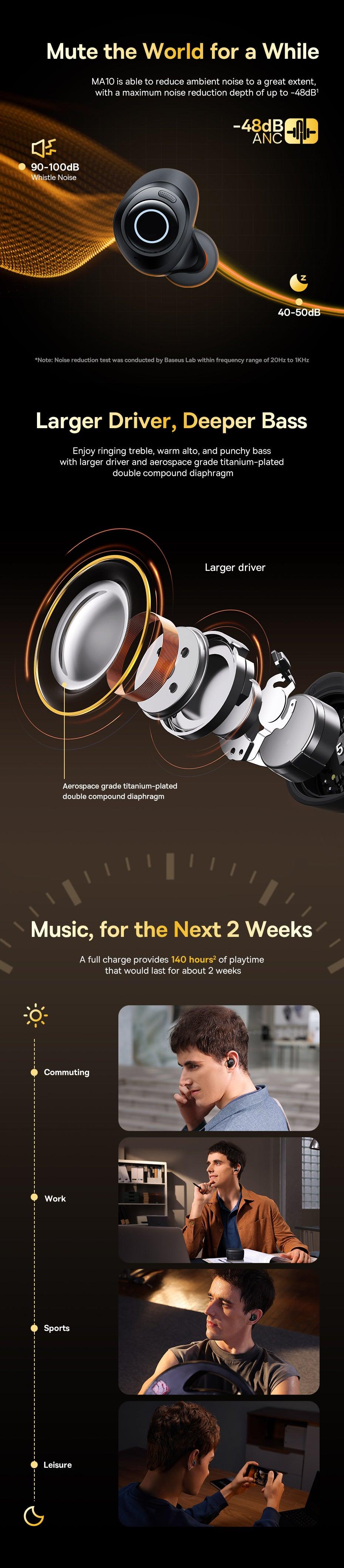 -48dB Noise Cancellation: The Baseus earphones MA10 utilises advanced algorithms for wide frequency and wind noise reduction, effectively erasing background sounds both indoors and outdoors.