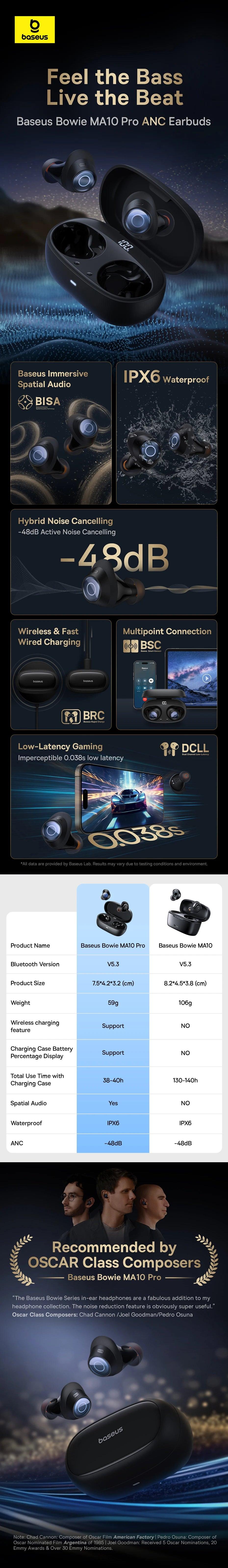 Baseus Bowie MA10 Pro ANC Wireless Bluetooth 5.3 Earphones - IPX6 Waterproof