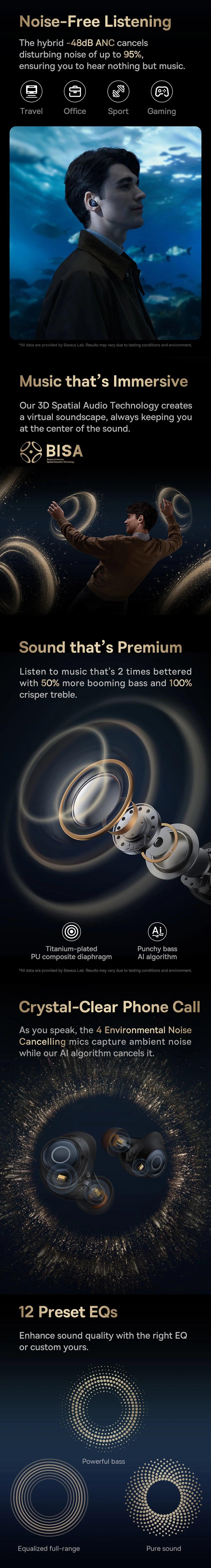 Baseus Immersive Spatial Acoustics: Provides an expanded sound stage that envelops you in the realm of digital visuals and audio.
