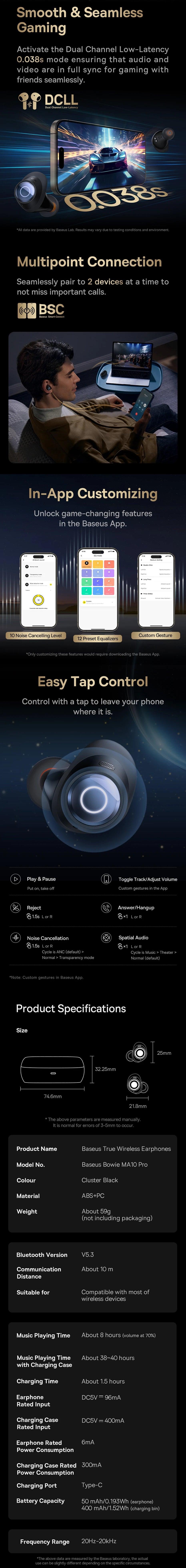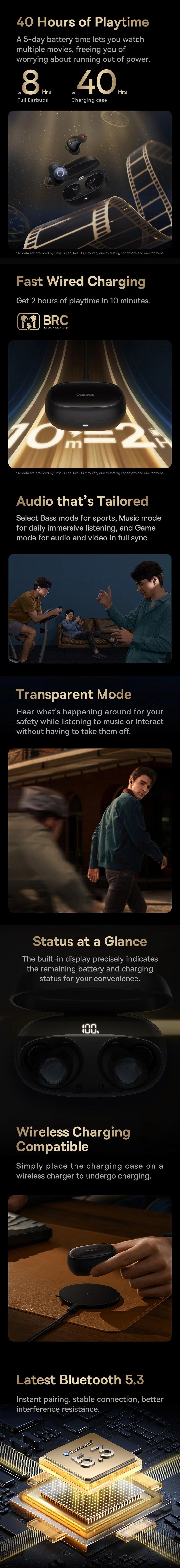 Baseus cutting-edge MA10 Pro wireless earbuds with -48dB Noise Cancellation for clear audio, eliminating background noise indoors and outdoors. With a remarkable 40-hour battery life, including 8 hours on a single charge and 40 hours with the included case featuring wireless charging and battery display. With an IPX6 waterproof rating, they resist sweat, rain, and dust for enhanced durability during sports. Immerse yourself in audio with Baseus Immersive Spatial Acoustics, featuring a Titanium Plated Diaphragm for extended dynamics and minimal distortions. The Advanced Wireless 5.3 ensures low latency, providing a seamless and stable wireless experience.